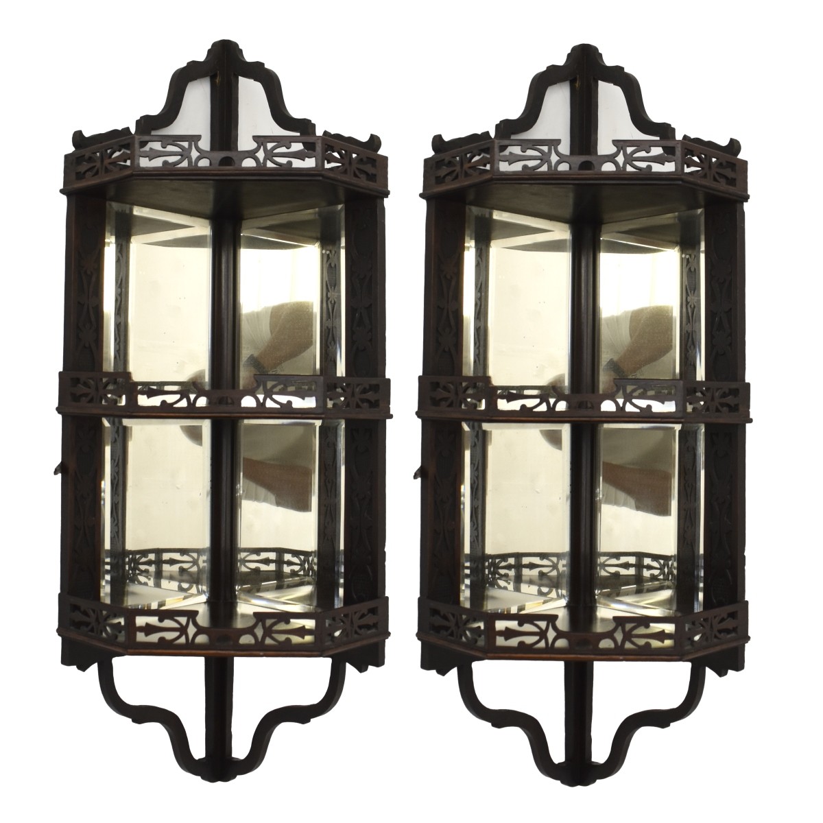 Pair Carved Chinese Chippendale Style Corner Etageres , with beveled back and side mirrors. Measures: 35-1/2" H, 9-3/4" W, 3" D. Condition: Good used condition, minor wood loss, some spotting to mirrors. Estimate: $200.00 - $600.00 Domestic Shipping: Third Party