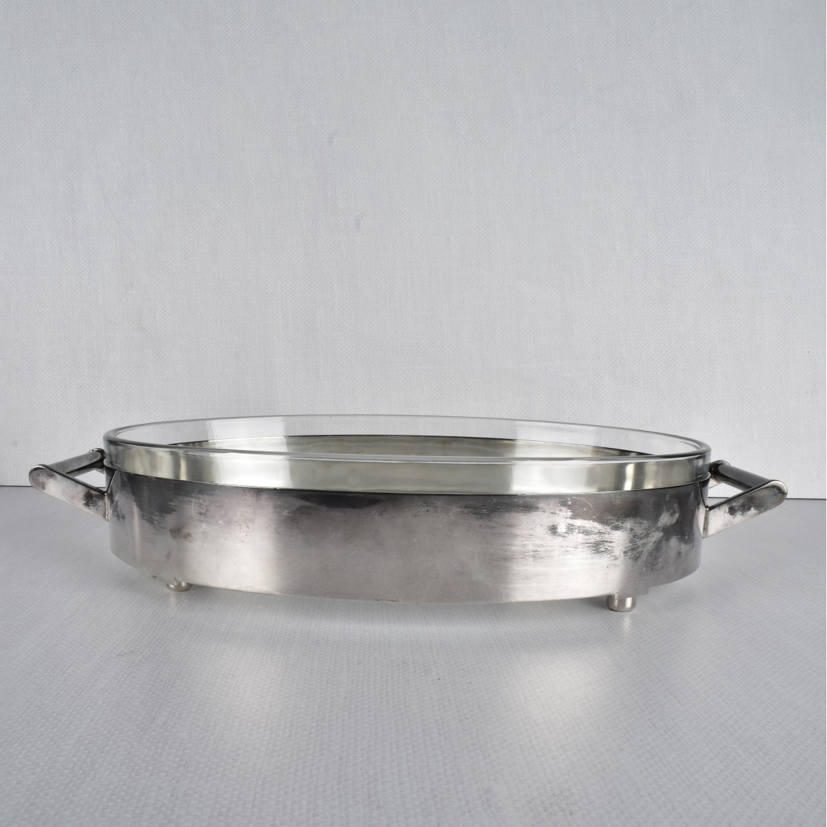 Two (2) Contemporary Silver Plate Casserole Serving Trays with Sovirel France Glass inserts. 20th century. Largest with glass insert measures: 3-1/4" H, 18-1/2" W, 10-3/4" W. Condition: Good condition. Estimate: $50.00 - $150.00 Domestic Shipping: Third party.