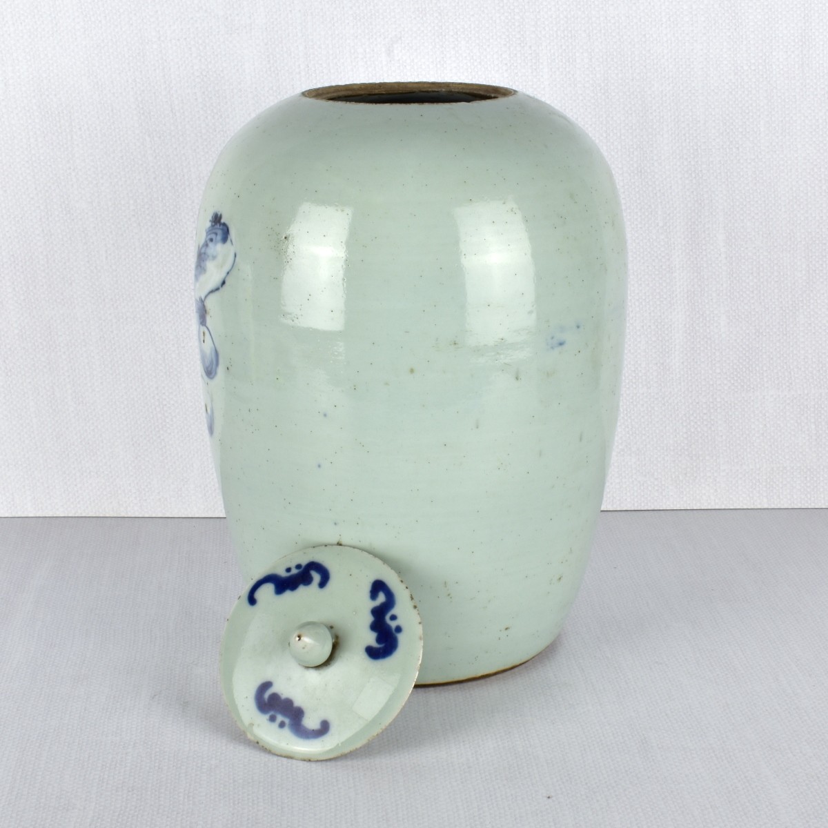 Chinese Celadon Figural Ginger Jar. With a lid having an acorn finial. Depicts Shou Lao with other figures. Unmarked. 19th century. Measures: 11-3/4" H, 8-1/2" Dia. Condition: Good condition. Estimate: $150.00 - $250.00 Domestic Shipping: Third party.