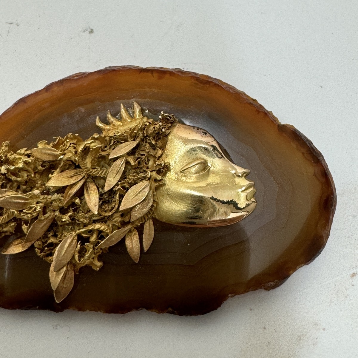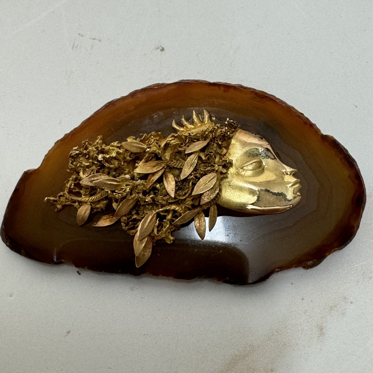 Vintage Agate Banded Geode Pendant with Relief Inlaid Gold Nubian Bust. With metal pin clasp to back. Measures 2-1/2" H, 1-1/4" W. Condition: Good vintage condition. Estimate: $200.00 - $250.00 Domestic Shipping: $40.00