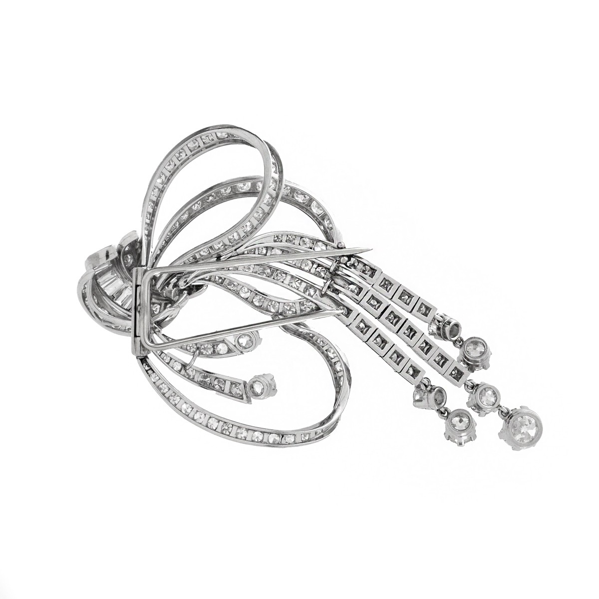 Retro Circa 1940s Approx. 15.0 Carat TW One Hundred Forty-one Round Brilliant and Baguette Cut Diamonds and Platinum Bow Brooch. Largest diamond weighs approx. 1.25 carat. Largest eight round brilliant cut diamonds F-G color, SI1-SI2 clarity. Accent diamonds F-G color, VS1-VS2 clarity. Measures 3" L, 1-7/8" W. Approx. weight: 27.74 grams. Condition: Very good vintage condition. For additional information and/or WhatsApp video please contact our resident GIA Graduate Gemologist, Russ Kodner at 954.650.5030 Estimate: $8000.00 - $10,000.00 Domestic Shipping: $40.00