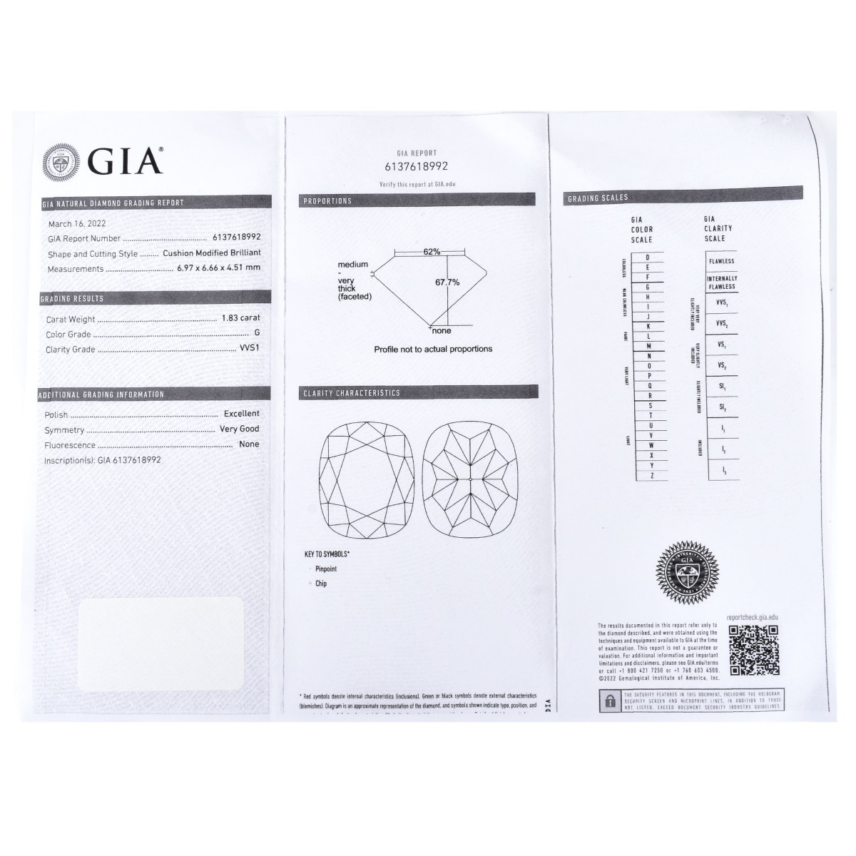 GIA Certified 1.83 Carat Cushion Cut Diamond and 18 Karat White Gold Halo Engagement Ring. Center diamond G color, VVS1 clarity. Accented with numerous round brilliant cut diamonds, E-F color, VS clarity. Ring size 6-1/4. Approx. weight: 3.43 grams. GIA Report 6137618992 dated 3/16/2022 to accompany this lot. Condition: Very good condition. Please refer to GIA report. For additional information and/or WhatsApp video please contact our resident GIA Graduate Gemologist, Russ Kodner at 954.650.5030 Estimate: $16,000.00 - $20,000.00 Domestic Shipping: $40.00