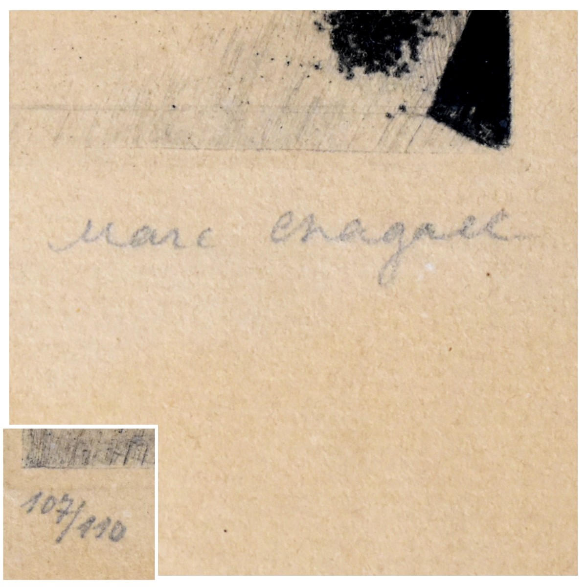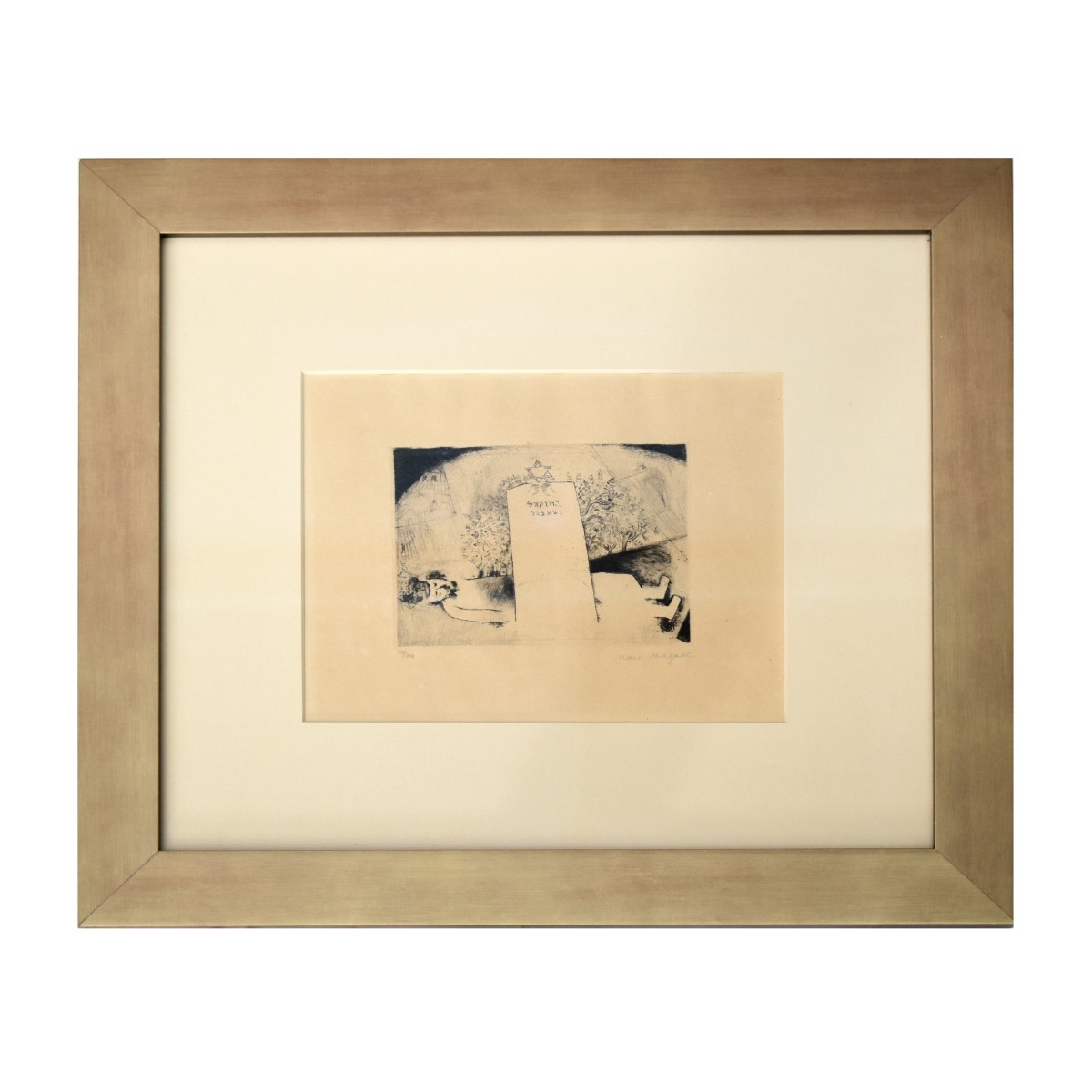 Marc Chagall, Bellarusian / French (1887-1985), 1922 Etching and Drypoint "Grab des Vaters" (from Mein Leben). Signed lower right, numbered 107/110. Paul Cassirer publisher. Measures 4-1/4: H, 6" W. Frame measures 16-1/4" H, 18-1/4" W. Condition: Toning otherwise good condition. Estimate: $2000.00 - $4000.00
