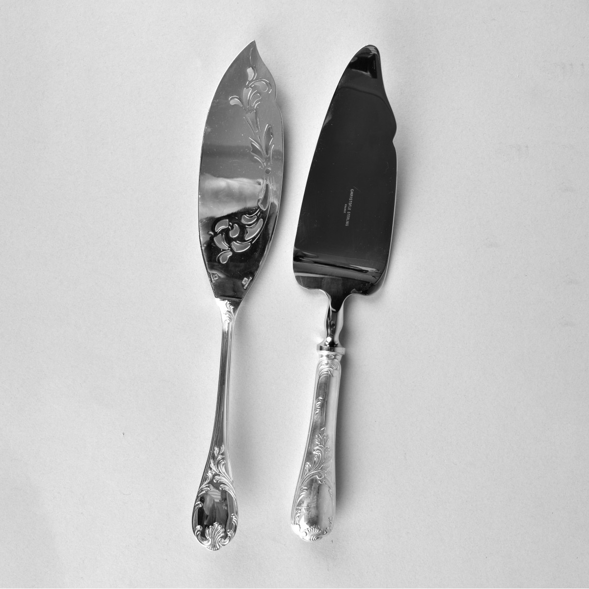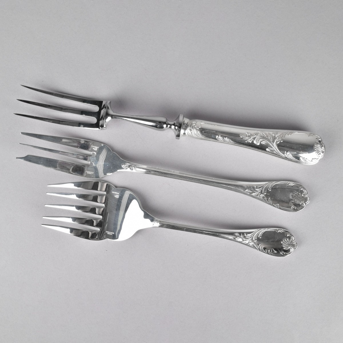 Christofle Sterling Silver Flatware in the "Marley" Pattern. Consisting of twelve (12) dinner knives, measures: 9-5/8" L, twelve (12) soup spoons, measures: 7-1/2" L, twelve (12) salad forks, measures: 7" L, twelve (12) desert spoons, measures: 5-7/8" L, twelve (12) butter spreaders, measures: 7-5/8" L, twelve (12) fruit forks, measures: 6-1/2" L, one (1) serving fork, measures: 9-3/4" L, one (1) serving fork, measures: 8-1/2" L, one (1) master butter knife, measures 8" L, twelve (12) salad forks, measures: 6-1/2" L, two (2) large serving spoons, measures: 9-3/4" L, one (1) carving knife, measures: 12-3/4" L, one (1) carving fork, measures: 10-3/4" L, one (1) ladle, measures: 11-3/8" L, one (1) gravy ladle, measures:7-1/8" L., and one (1) large serving fork, measures 10" L. Total weight with-out knives and serving pieces with stainless steel: Weight: 237.2 troy ounces, gross weight of pieces with stainless steel ends: 95.4 troy ounces. Condition: Very good condition. Estimate: $8000.00 - $12000.00 Domestic Shipping: Third Party