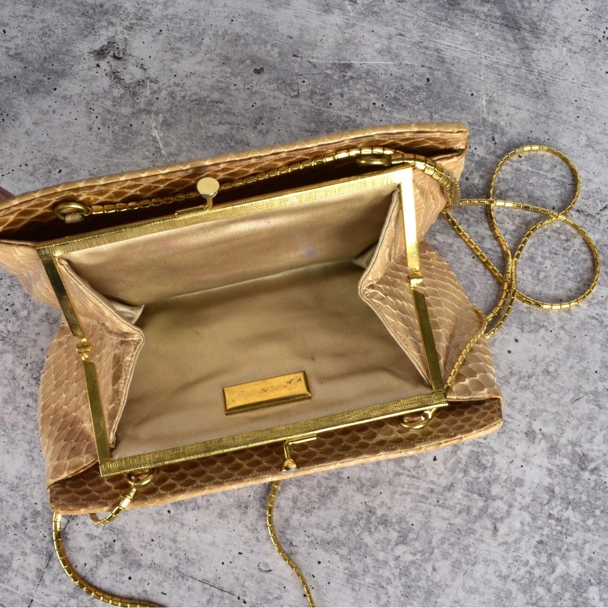 Item Condition: Silver bag is missing some crystals, some are stained and shoulder drop kinked. Black bag missing crystals and inside needs some attention. Tan snakeskin is worn.