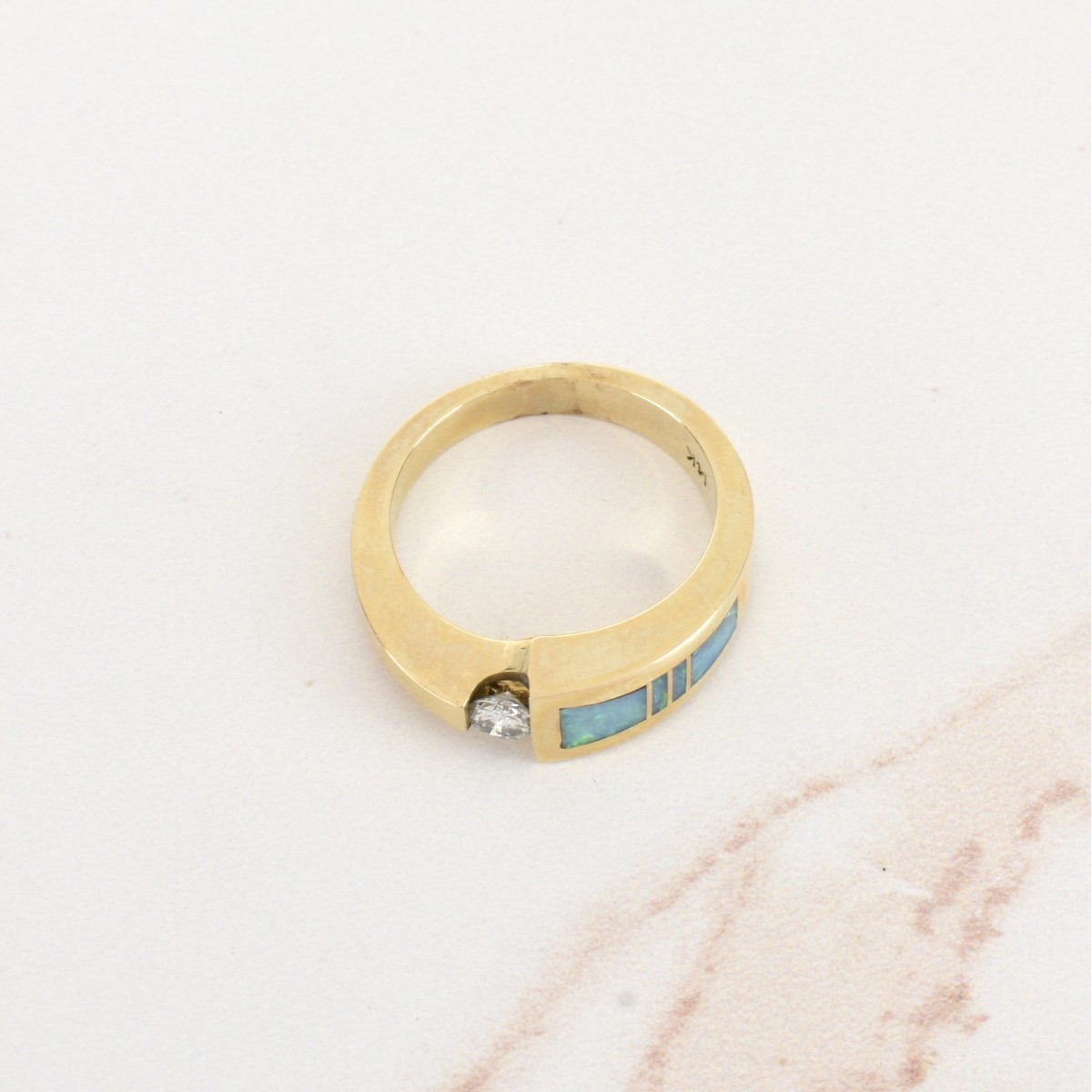 Vintage Black Opal Mosaic, Approx. .20 Carat Round Brilliant Cut Diamond and 14 Karat Yellow Gold Ring. Opal with good play of color. Diamond F color, VS2 clarity. Stamped 14K. Ring size 7-1/4. Approx. weight: 6.80 grams. Condition: As New unused condition. Estimate: $600.00 - $800.00 Domestic Shipping: $40.00