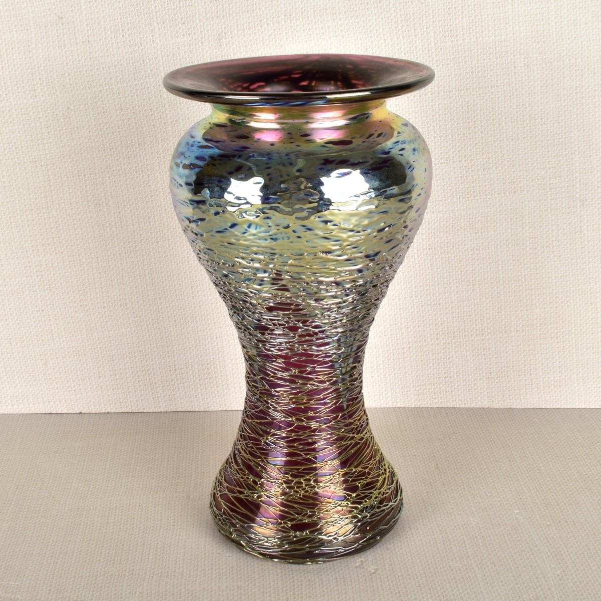 Stuart Abelman, (American) iridescent threaded vase in a baluster shape. Signed "Stuart Abelman 23-33 1987" on the bottom. Measures: 10-1/4" H, 5-1/2" D. Condition: Good condition. Normal cabinet wear to bottom, Estimate: $200.00 - $300.00 Domestic Shipping: $88.00