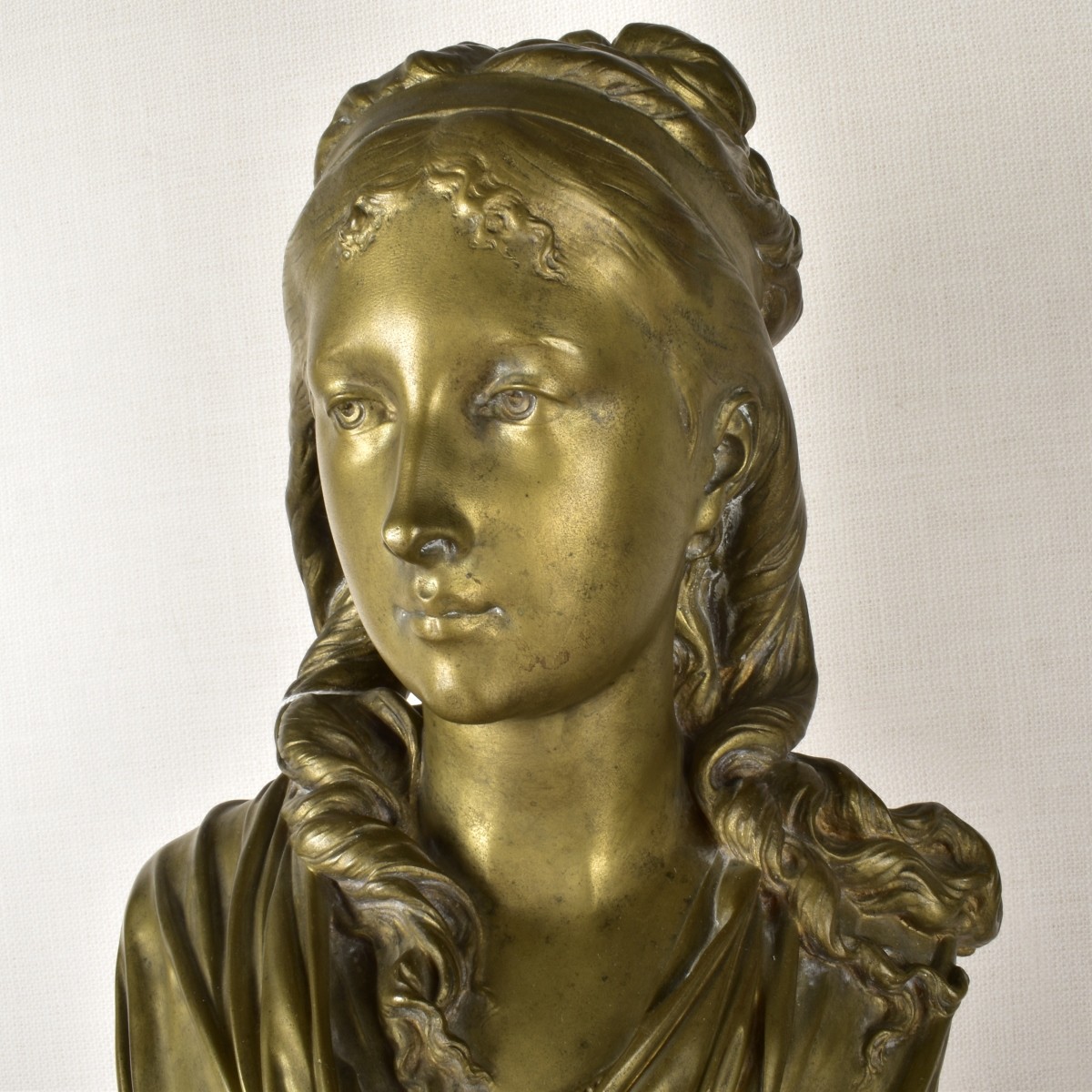 Albert-Ernest Carrier-Belleuse (French, 1824 - 1887). A bronze figurine of a woman's bust with long flowing hair. Signed "A. Carrier-Belleuse" on the back. Mounted on a square rouge color marble base. Measures: 20" H, 11" W, 9" D. Condition: Good condition, some normal age wear to bronze, commensurate with age. Estimate: $600.00 - $800.00 Domestic Shipping: Third party
