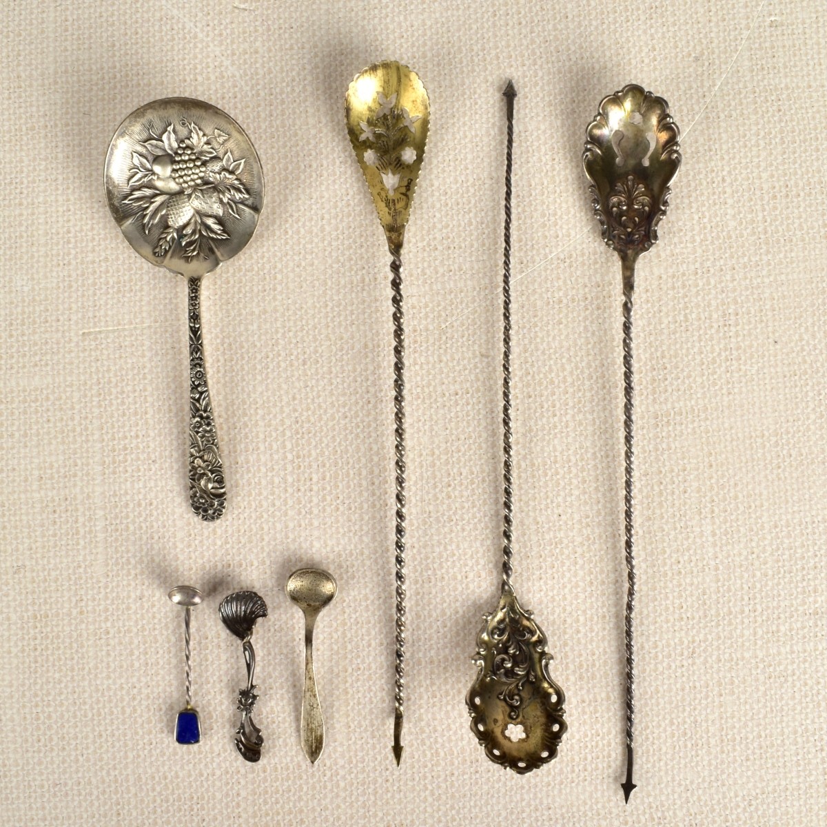 Seven (7) Antique Sterling Silver Spoons. Longest measures: 9" L. Total weight 2.6 troy ounces. Condition: Good condition. Estimate: $100.00 - $200.00 Domestic Shipping: $46.00