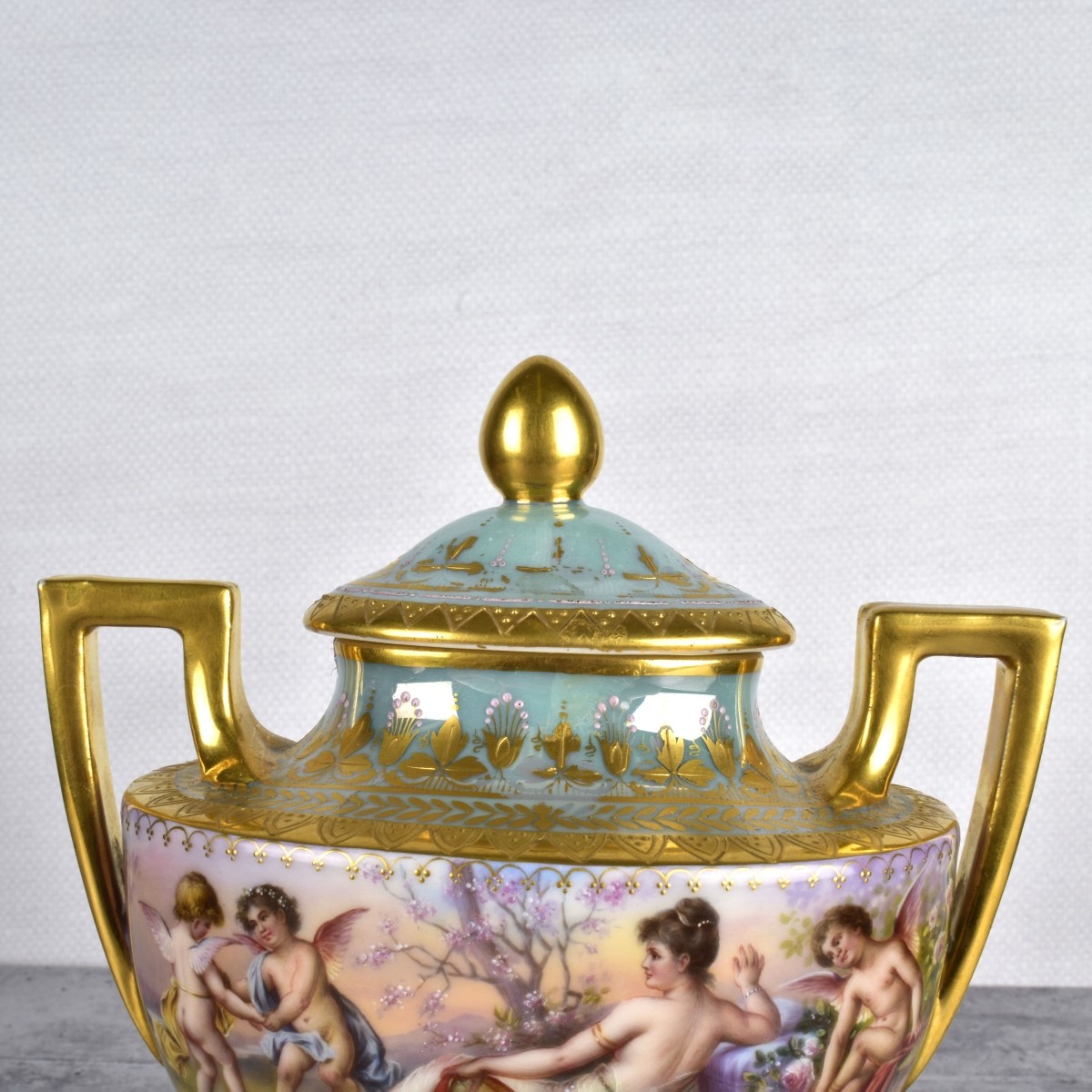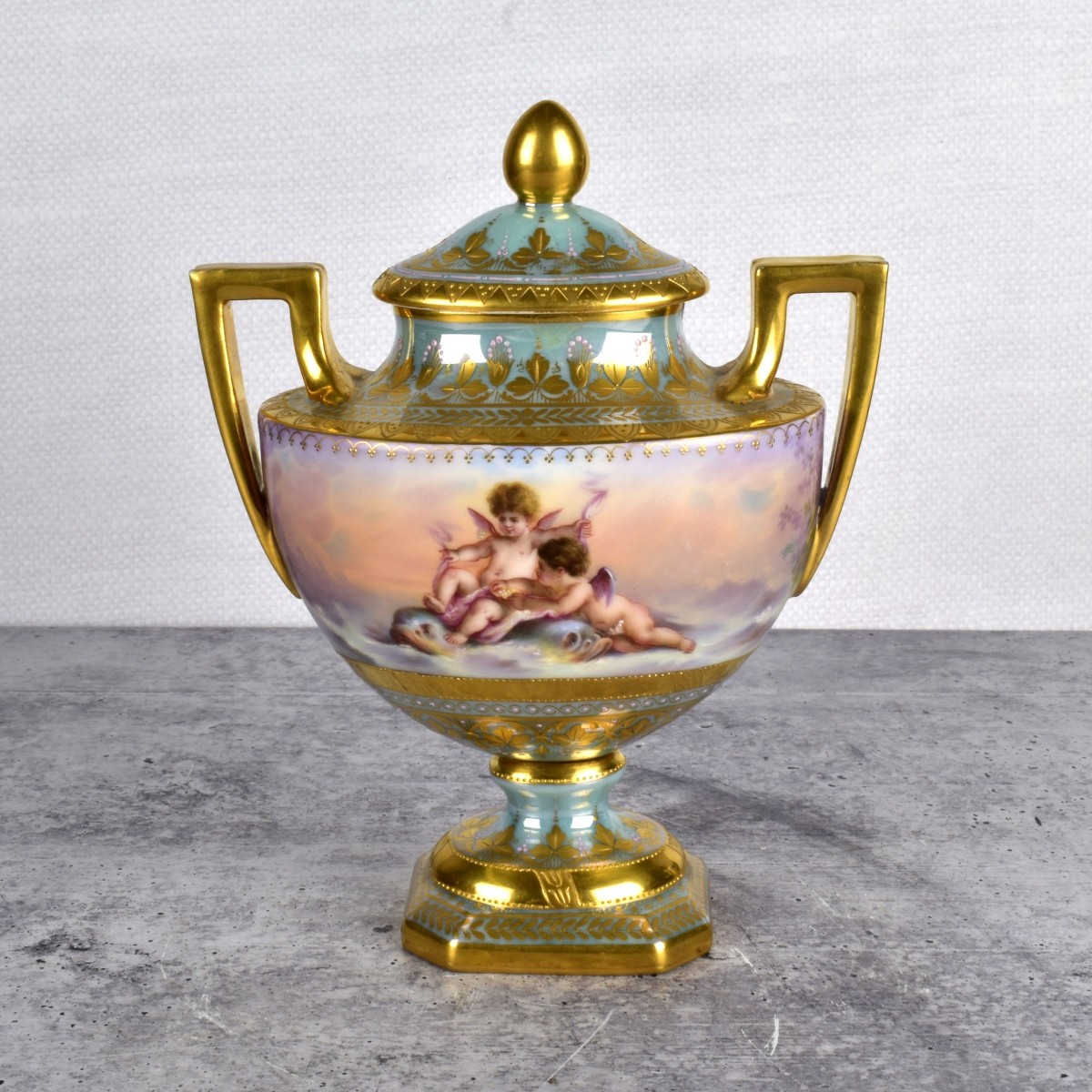 Antique Hand Painted Royal Vienna Porcelain Urn with Cover. Decorated with a hand painted continuous scene and gilt decoration on a rectangular pedestal base. Marked with the Royal Vienna beehive mark under glaze, artist signed. Early 20th century. Measures: 7" H, 6" W, 3-1/2" D. Condition: Good condition. Estimate: $200.00 - $400.00 Domestic Shipping: $58.00