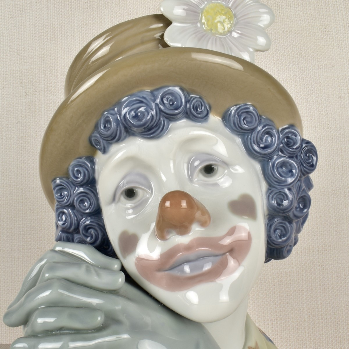 Lladro Figurine of a Sad Clown Wearing a Crumpled Hat with His Hands to the Side of His Face. Properly marked on the bottom. Measures: 11-1/4" H, 7-1/2" W, 8" D. Condition: Good condition. Estimate: $100.00 - $200.00 Domestic Shipping: $68.00