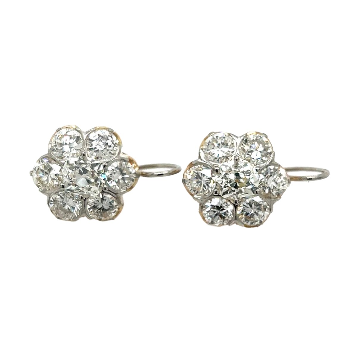 Approx. 5.50 Carat TW Diamond, Platinum and 18 Karat Yellow Gold Cluster Earrings. Set in the center with approx. 1.90 carat TW two old mine cut diamonds, J-K color, VVS-VS clarity. Accented with approx. 3.60 carat twelve old mine cut diamonds, H-I color, VS1-SI1 clarity. Measure 1". Approx. total weight: 7.2 grams. Condition: Very good condition. For additional information and/or WhatsApp video please contact our resident GIA Graduate Gemologist, Russ Kodner at 954.650.5030 Estimate: $18,000.00 - $22,000.00 Domestic Shipping: $40.00