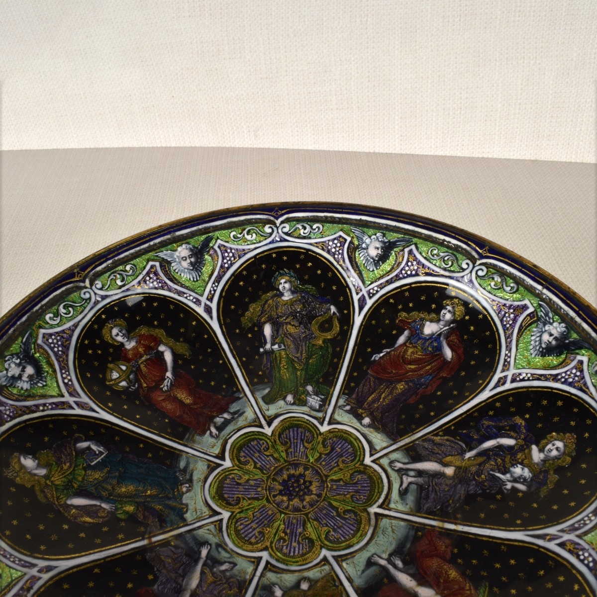 19th Century Limoges Iridescent Enameled Coupe on an Enameled Pedestal Base. Decorated Reserves with Deities in the Bowl and Nudes in the Reserves on the Footed Base Raised on Four Angular Foliate Feet and Attached Scrolled Foliate Handles. Measures: 5-1/2" H, 10" L, 7-1/2" D. Condition: Good condition. Estimate: $4000.00 - $6000.00 Domestic Shipping: $88.00