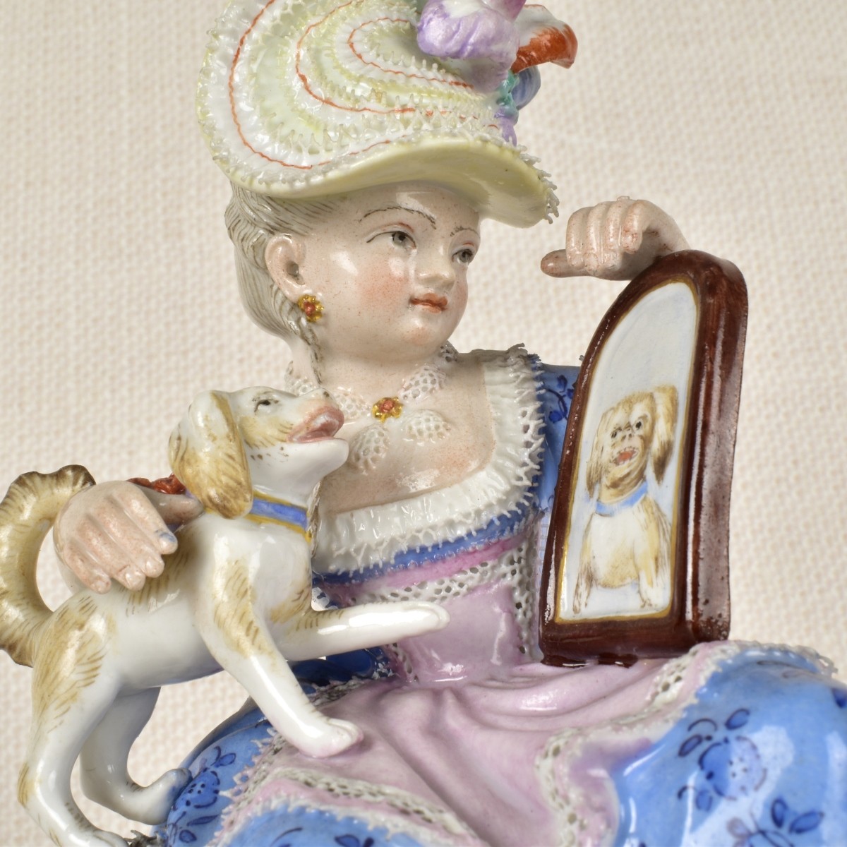 Meissen Porcelain Figurine of a Seated Lady Holding a Mirror with A Dogs Reflection. Marked with the Meissen Crossed Swords Under Glaze as well as Incised Number "43" and Number "J30" as well as Painter Number "10" in Red Paint. 19th Century. Measures" 6-1/16" H, 3" W, 4 " D. Condition: Good condition. Estimate: $400.00 - $600.00 Domestic Shipping: $46.00
