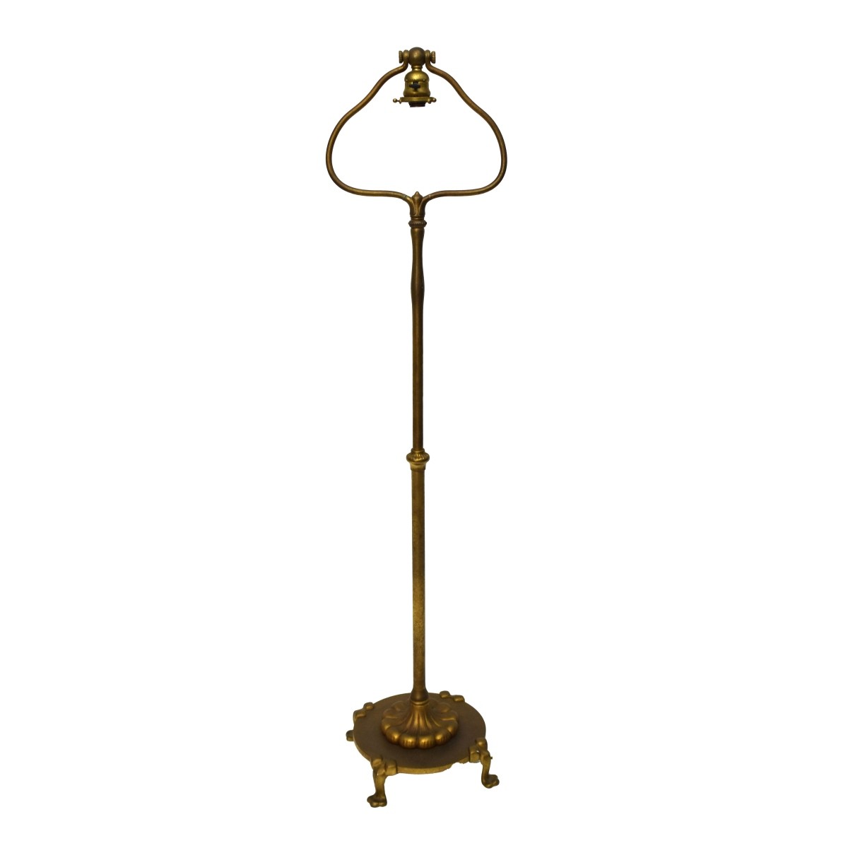 Tiffany Studios Harp Floor Lamp with a Linen Fold Shade and Gilt Bronze Base. Favrile amber and green glass shade. Shade marked "Tiffany Studios New York " base marked "Tiffany Studios New York 582". Base measures 56-1/2" H, 14" Dia. Condition: Overall good condition, harp has an old repair, when shade in place not visible. Estimate: $5000.00 - $7000.00 Domestic Shipping: Third Party.