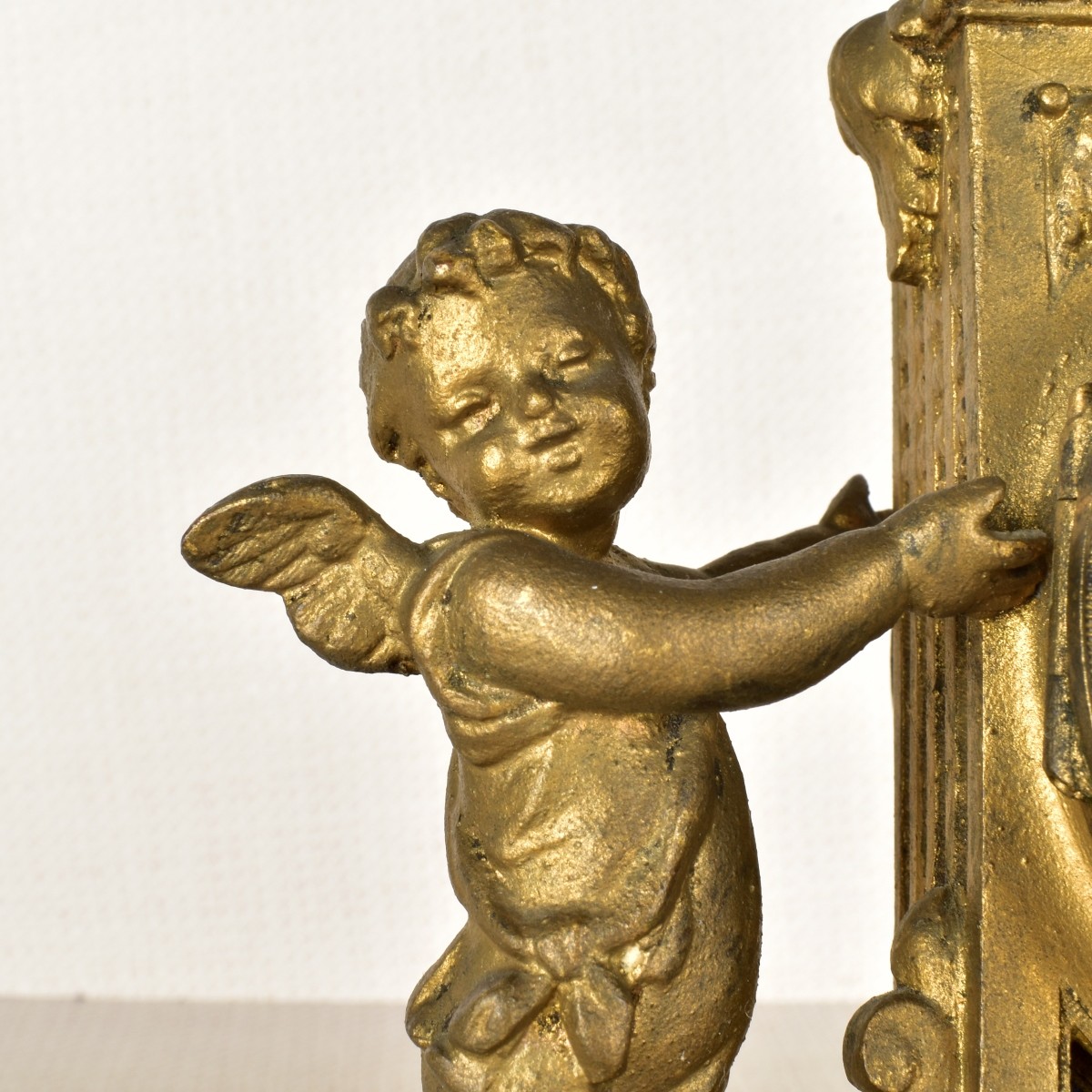 Neo-Classical Style Gold Gilt Bronze Clock Decorated with a Young Putti to Each Side and Two (2) Champleve Panels, the Bezel with a Surround of Diamonettes. 20th century. Measures: 7-3/4" H, 7-1/4" W, 3-1/2" D. Condition: No key present. Wear to finish. Please note the galley does not warranty the running condition of clocks. Estimate: $300.00 - $500.00 Domestic Shipping: $58.00