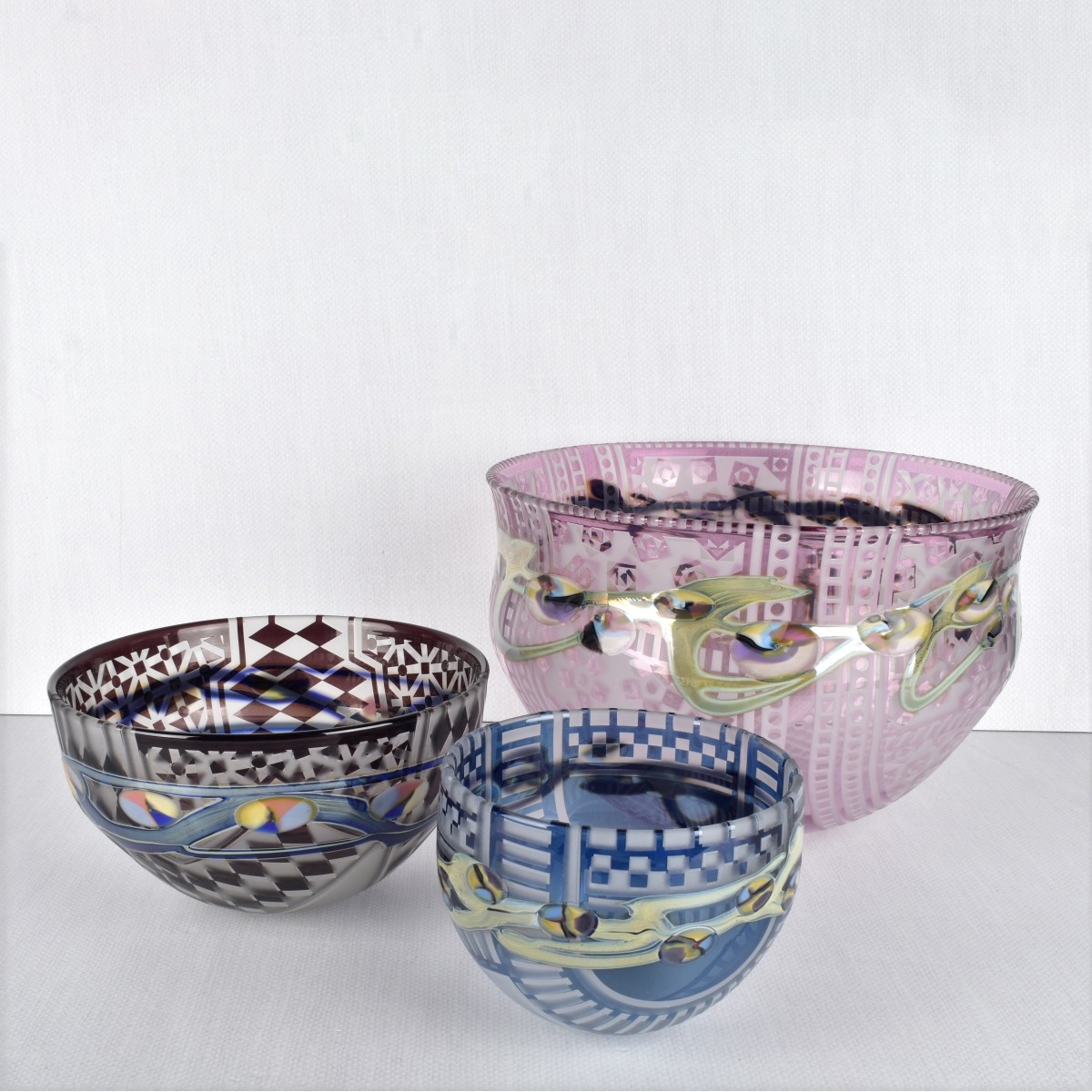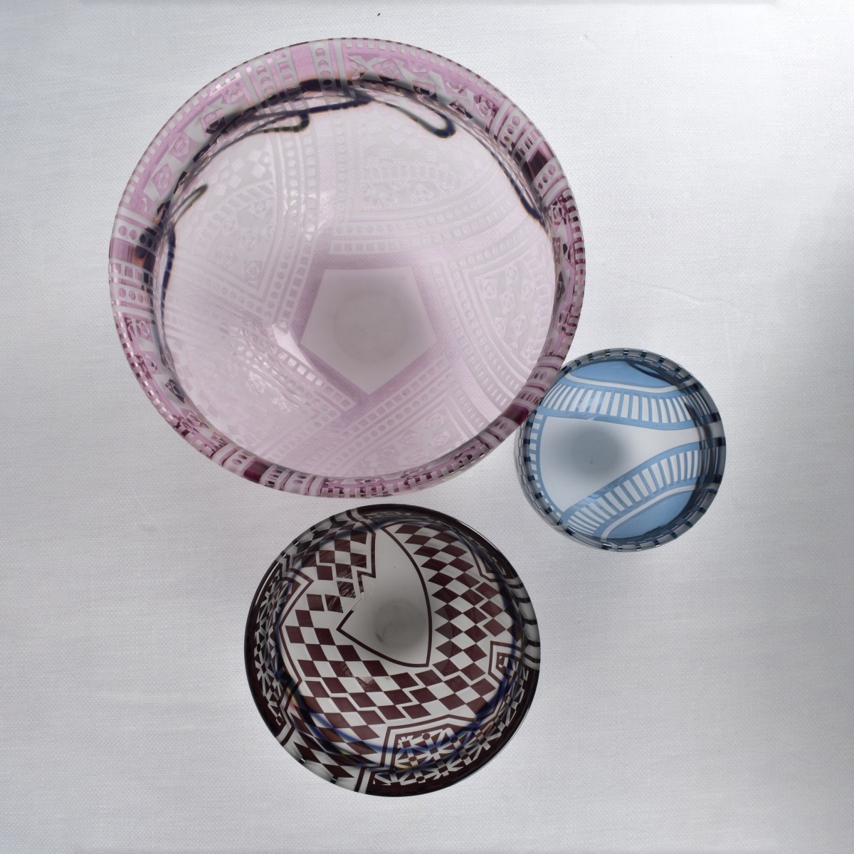 Three (3) Modern Art Glass Bowls with Geometric Designs in Brilliant Colored Glass. Unsigned. Largest measures: 7-3/4" H, 11-1/2" Dia., smallest measures: 4-1/2" H, 5-3/4" Dia. Condition: Good condition. Estimate: $100.00 - $200.00 Domestic Shipping: Third party.
