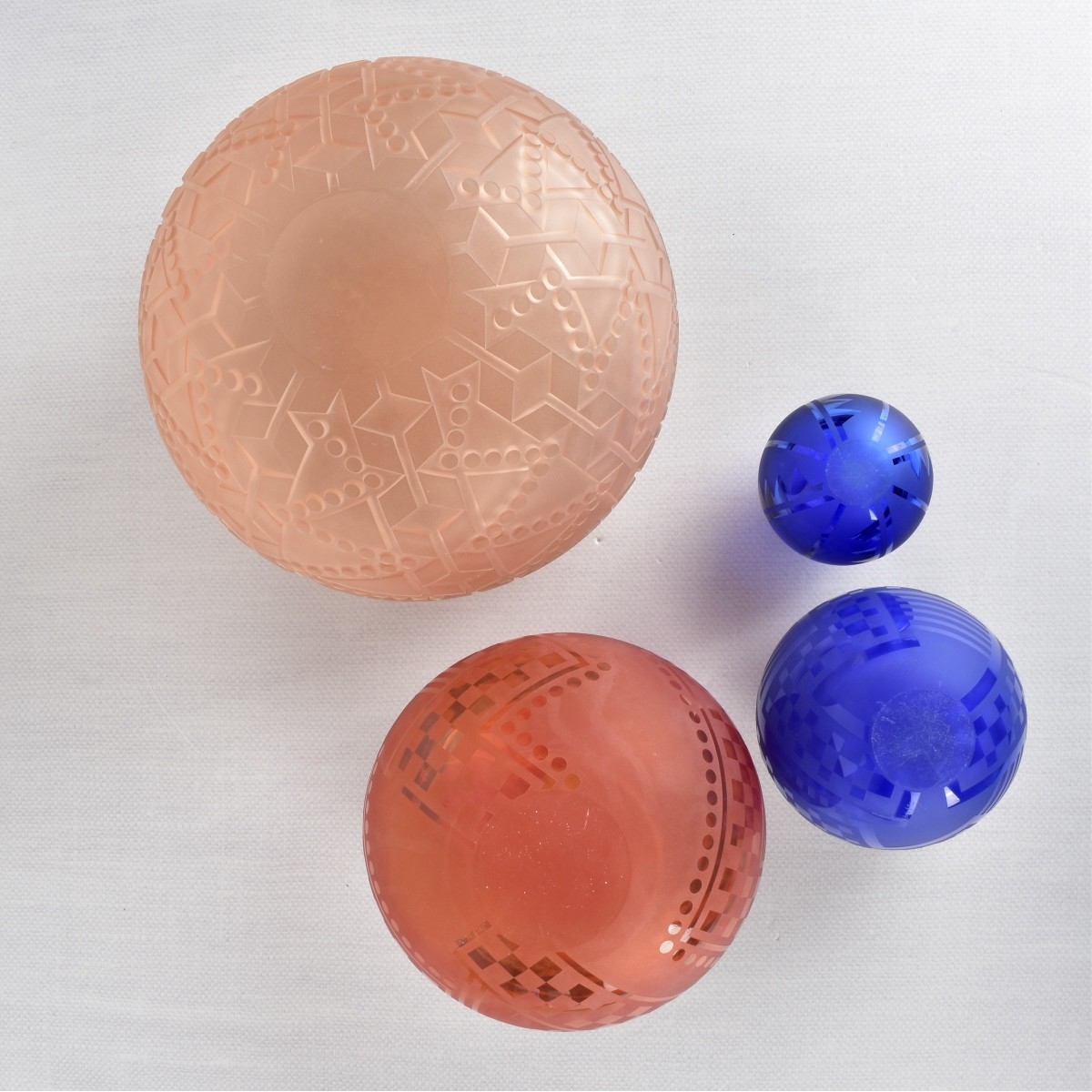 Four (4) Vintage John Byron Art Glass Vases. Three artist signed. Largest measures : 7-1/2" H, 9" Dia., smallest measures: 3-3/4" H, 3" Dia., Condition: Good condition, normal cabinet wear to bottom. Estimate: $100.00 - $200.00 Domestic Shipping: Third party.