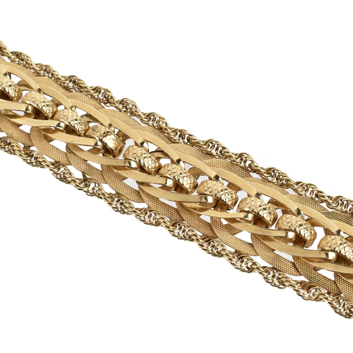 Fine Vintage 14 Karat Yellow Gold Wide Charm Bracelet. Stamped 14K. Measures 7-1/4" L, 7/8" W. Approx. weight: 35.20 grams. Condition: Very good vintage condition. For additional information and/or WhatsApp video please contact our resident GIA Graduate Gemologist, Russ Kodner at 954.650.5030 Estimate: $2000.00 - $3000.00 Domestic Shipping: $40.00