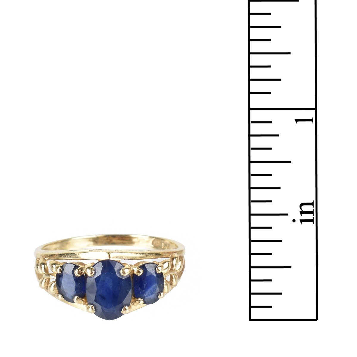 Vintage Oval Cut Sapphire and 14 Karat Yellow Gold Three Stone Ring. Stamped 14K. Ring size 6-1/2. Approx. weight: 2.77 grams. Condition: Very good condition. For additional information and/or WhatsApp video please contact our resident GIA Graduate Gemologist, Russ Kodner at 954.650.5030 Estimate: $200.00 - $400.00 Domestic Shipping: $40.00