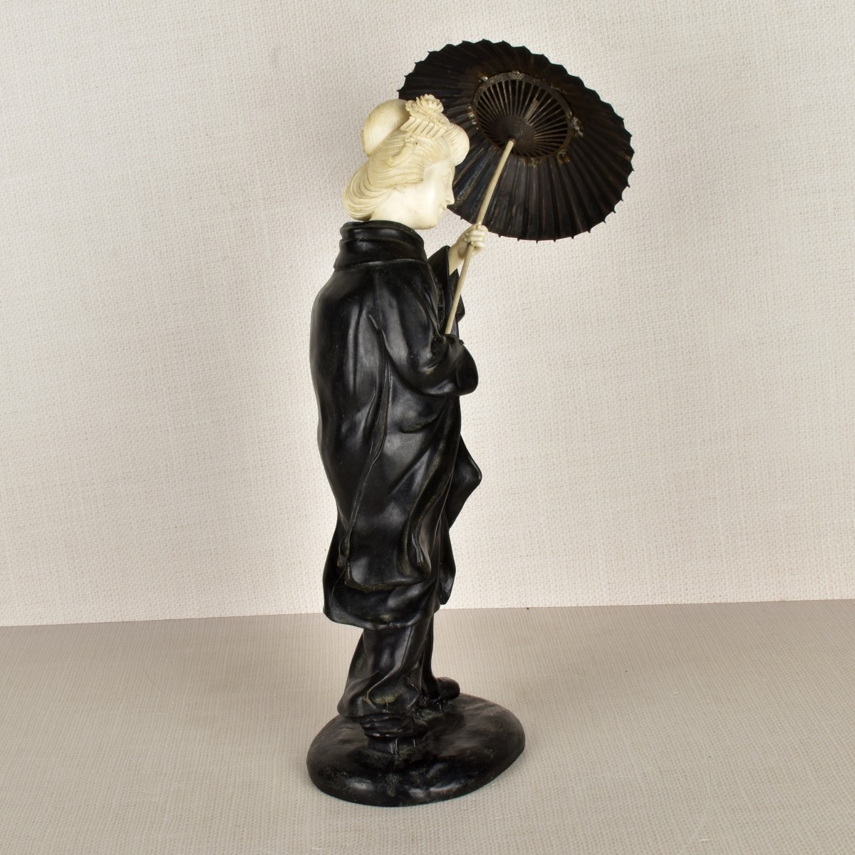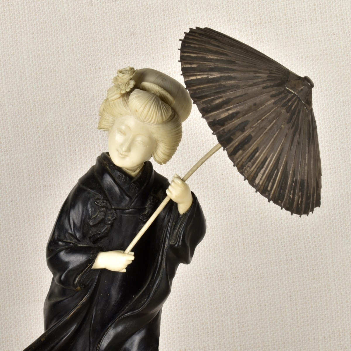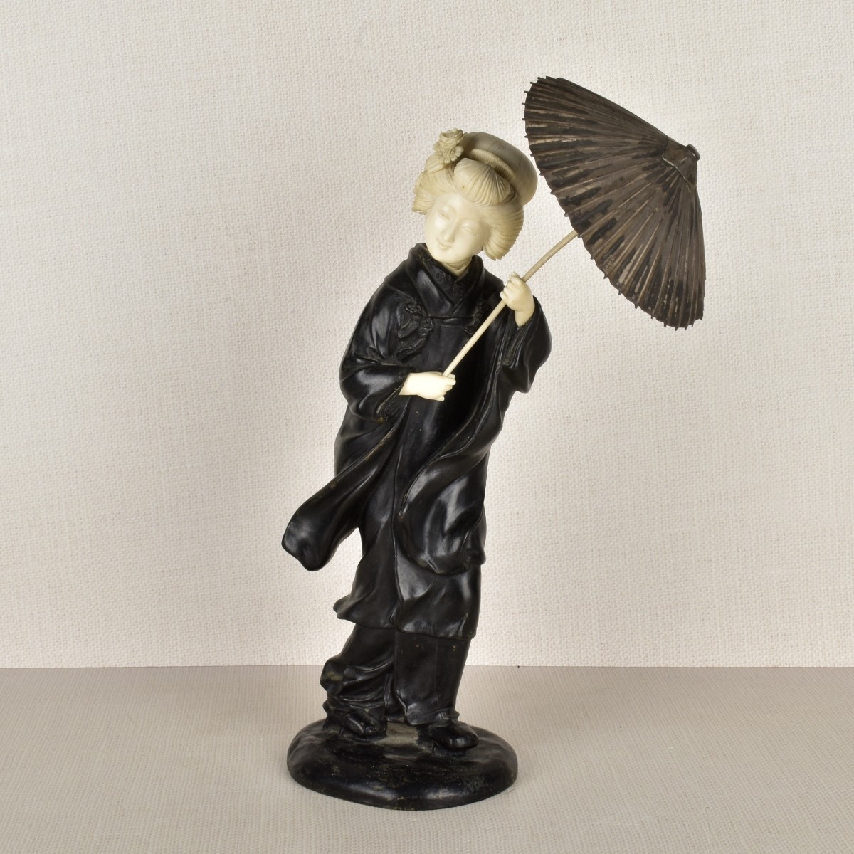 Japanese Carved Smiling Geisha with Beautifully Carved Flowers in Her Coiffed Hair and Holding a Parasol in Both Hands. Artist signed in English as well as in Japanese character marks. Bottom marked "Made in Occupied Japan, mid 20th century. Measures: 13" H, 4-1/2" W, 3-1/4" D. We Will Not Ship This Item Outside of the State of Florida. Anyone Having This Item Shipped Must Have a Florida Address or the Item will not be Shipped. We will Not Knowingly Sell Endangered Species outside of Legal Channels. Condition: Good condition. Estimate: $1,000.00 - $1,500.00 Domestic Shipping: $88.00