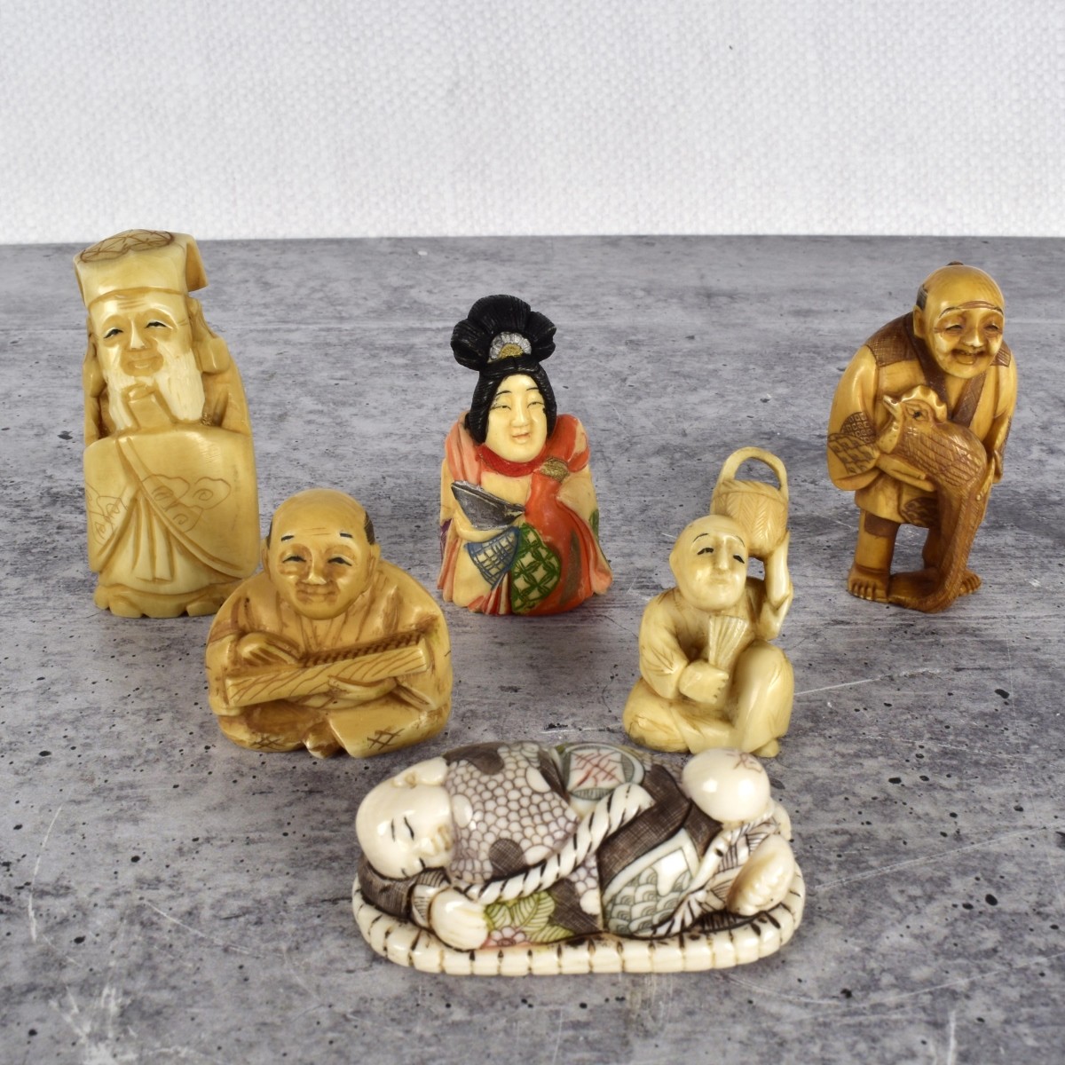 Lot of Six (6) Antique Japanese Polychromed Carved Netsukes. Artist signed to the bottoms. Tallest measures: 2-1/4" H, 1" W, 3/4" D. Condition: Good condition. We Will Not Ship This Item Outside of the State of Florida. Anyone Having This Item Shipped Must Have a Florida Address or the Item will not be Shipped. We will Not Knowingly Sell Endangered Species outside of Legal Channels. Estimate: $100.00 - $200.00 Domestic Shipping: $40.00 (FL only).