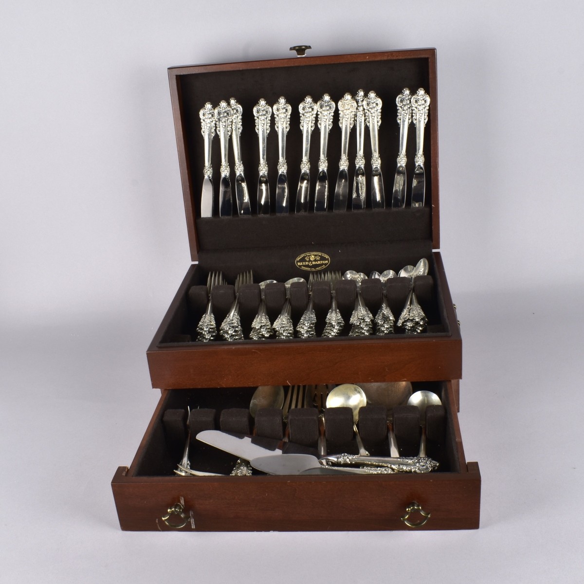 Eighty Three (83) Piece Wallace "Grand Baroque" Sterling Silver Flatware Set. Includes: Twelve (12) knives, measuring: 8-7/8 L, twelve (12) dinner forks, measures: 7-3/8" L, twelve (12) salad forks, measures: 6-5/8" L. twelve (12) round soup spoons, measures: 6-1/8" L. twenty four (24) teaspoons, measures: 6-1/8" L, one (1) serving fork, measures: 9-3/8" L, one (1) large serving spoon, measures: 9-1/4" L, one (1) serving spoon, measures: 8-3/4" L, one (1) serving fork, measures: 8-1/8" L, one (1) pierced serving fork, measures: 8-5/8" L, one (1) berry spoon, measures: 6-1/2" L, one (1) gravy ladle, measures: 6" L, one (1) lemon fork, measures; 5-3/8" L, one (1) cake server, measures: 10-3/4" L, one (1) pastry server, measures: 7-1/2 " L and one (1) cheese knife, measures: 6-1/2" L. Weighs approx: 148.59 troy ounces with hollow handled items. Weighs approx. 108.98 troy ounces without hollow handled items. All appropriately stamped. Box is for display purposes only. Condition: Very good condition. Estimate: $3000.00 - $5000.00 Domestic Shipping: Third party.