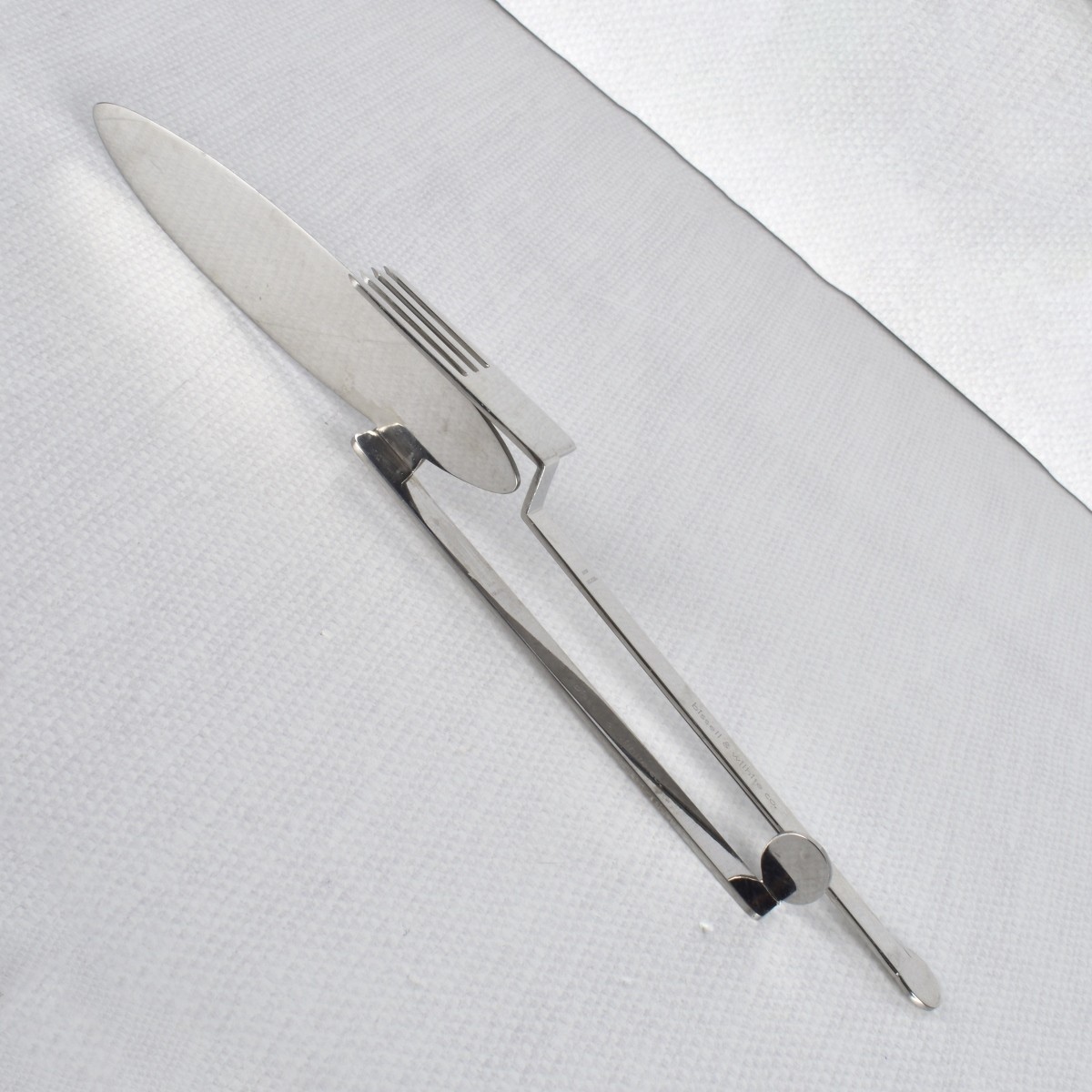 XUM by Bissell & Wilhite Seventy (70) Pieces Stainless Steel Flatware Set. Consisting of nineteen (19) dinner forks, measures: 8" L, eighteen (18) salad forks, measures 7-1/2" L, fourteen (14) soup spoons, measures: 8-1/4" L, nine (9) tea spoons, measures: 6-1/4" L, twenty (20) knives, measures: 10" L. All properly stamped "Japan Pat. Pend. Bissell & Wilhite Co.". Condition: Very good condition. Estimate: $400.00 - $800.00 Domestic Shipping: $88.00