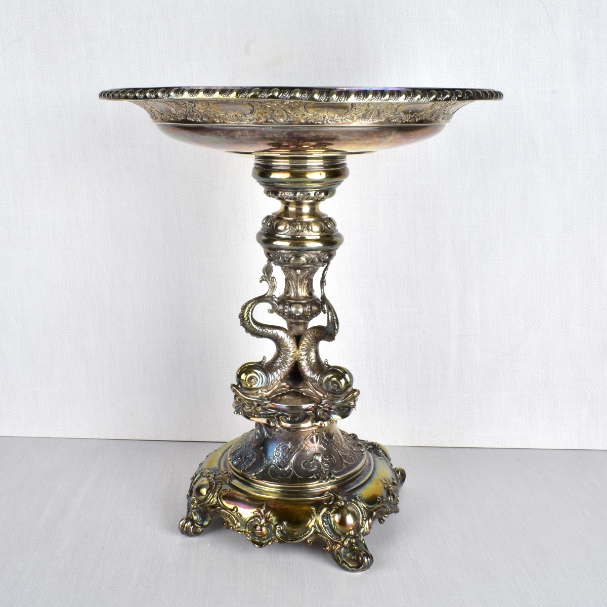 Continental 800 Silver Art Nouveau Large Centerpiece Tazza Decorated with Three (3) Dolphins to the Side and Supported on Four (4) Curved Foliate Feet. Stamped "800". Measures: 15-1/2" H, 13" Dia. Total weight 40 troy ounces. Condition: Good condition. Estimate: $400.00 - $600.00 Domestic Shipping: Third party.