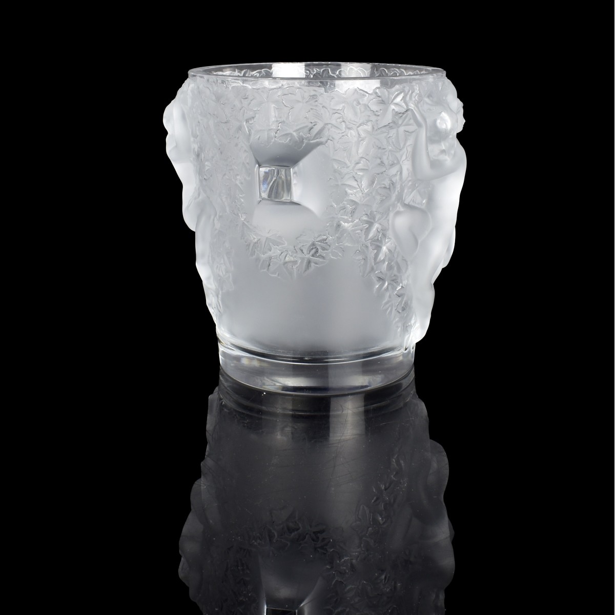 Rene' Lalique Ganymede Frosted Ice Bucket. Signed appropriately to bottom. Measures 9" H x 9-1/2" W. Condition: Good used condition, Scuff marks to bottom as would be. Estimate: $1000.00 - $2000.00 Domestic Shipping: $88.00