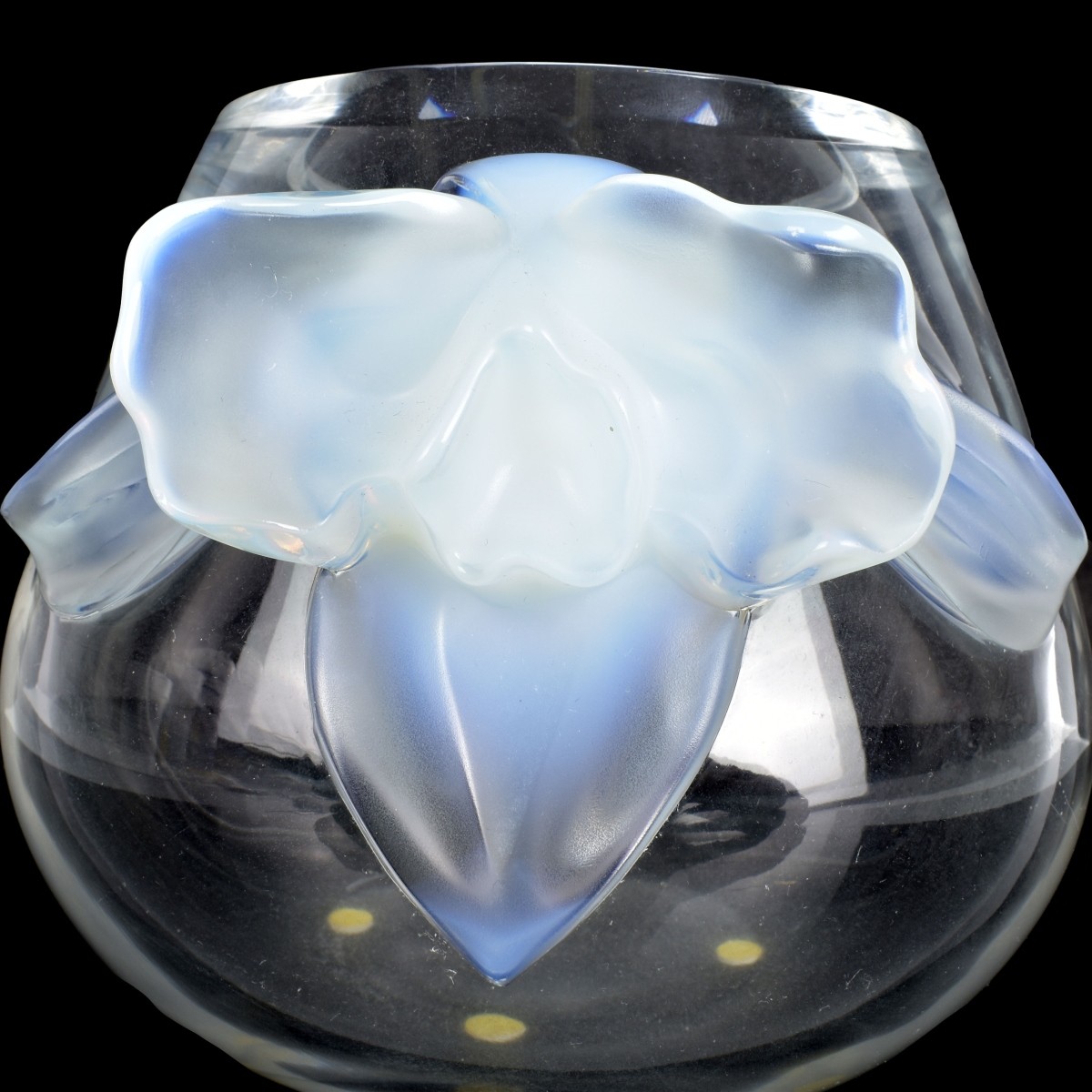 Lalique France Crystal Orchidee Vase. Signed appropriately to bottom. Measures 6-1/2" H x 9" W. Condition: Good used condition, some light scratching to bottom and some felt tabs. Estimate: $400.00 - $600.00 Domestic Shipping: $78.00