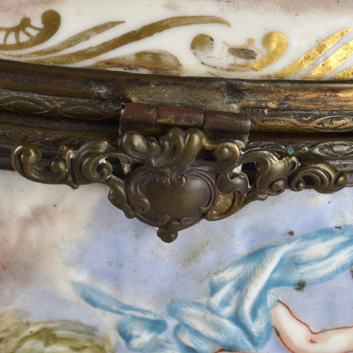 Antique Italian Capodimonte Porcelain Hand Painted Hinged Box. Decorated with Mythological Genre Scenes . Mid Early to mid 20th century. Measures: 5-1/2" H, 8-1/2" W, 5-1/2" D. Condition: Good condition, firing cracks to inside bowl. Estimate: $100.00 - $200.00 Domestic Shipping: $68.00