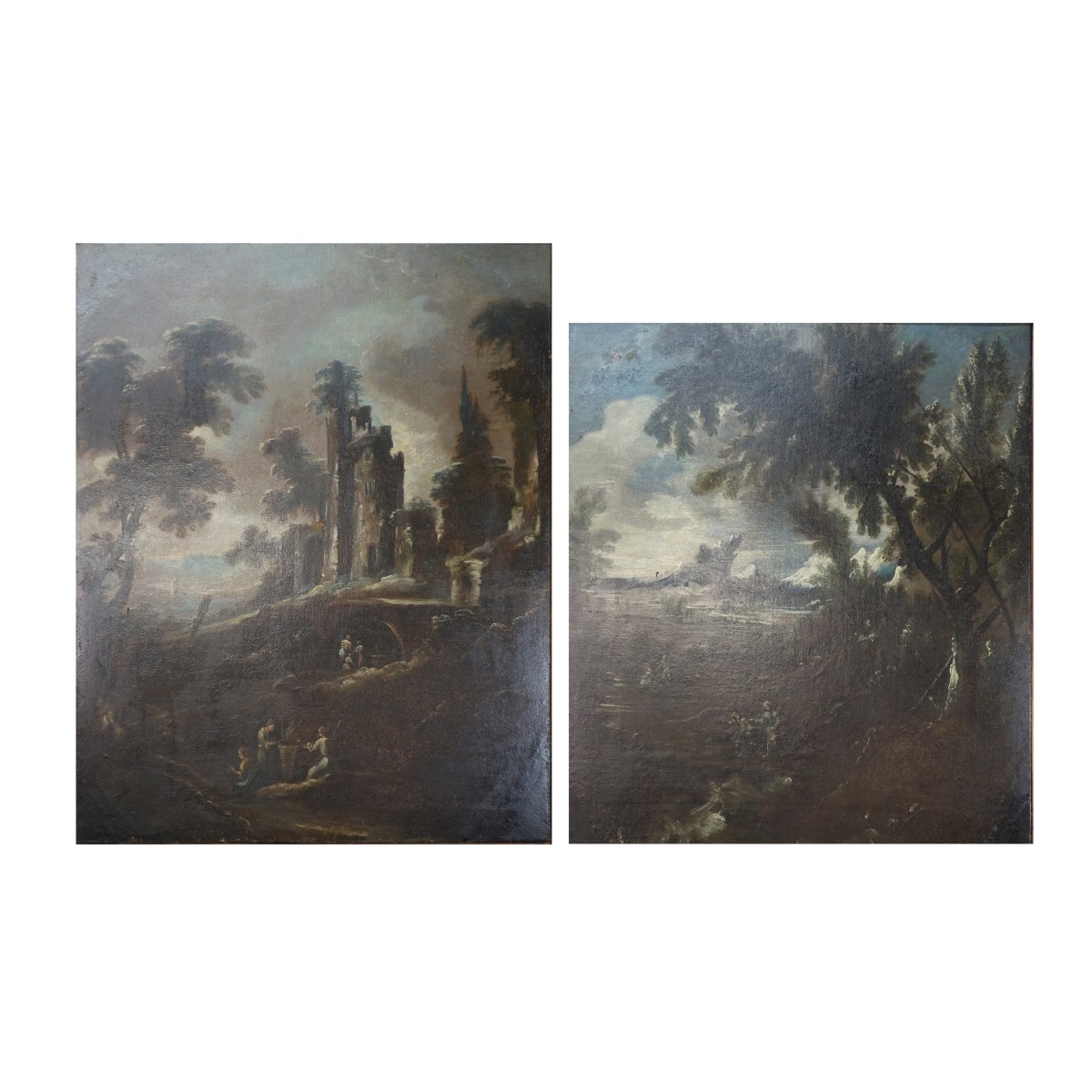 Two in the Manner of: Alessandro Magnasco, Italian (1667 - 1749) Each Depicting Topographical Scenes with Figures, Two Important Oil on Canvas in Gilt Carved Period Frames, Unsigned. Each measuring 50" x 39-1/2", frames measure 58-1/2" x 48". Condition: Condition is consistent with age, craquelure, some paint loss, has been relined otherwise good condition. Estimate: $5000.00 - $8000.00 Domestic Shipping: Third party