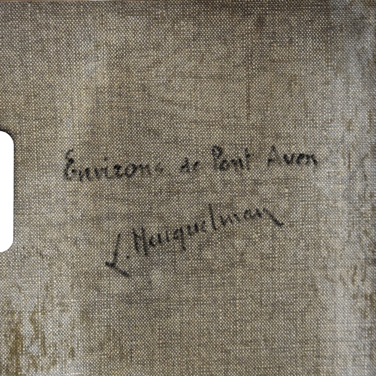 Lucien Neuquelman, French (1909-1988) Pointillist Oil on Canvas of a Village Scene. Signed bottom left hand corner. Viewing area measures: 14-1/2" H, 17-1/4" W, frame measures: 23" H, 26" W. Condition: Good condition, loose frame, some wood loss. Estimate: $1000.00 - $2000.00 Domestic Shipping: Third party.