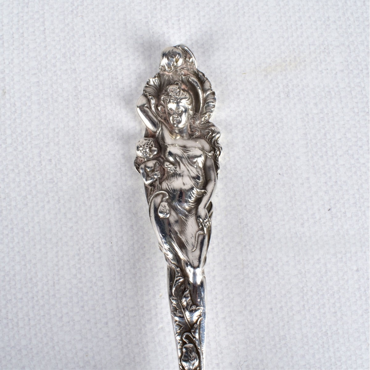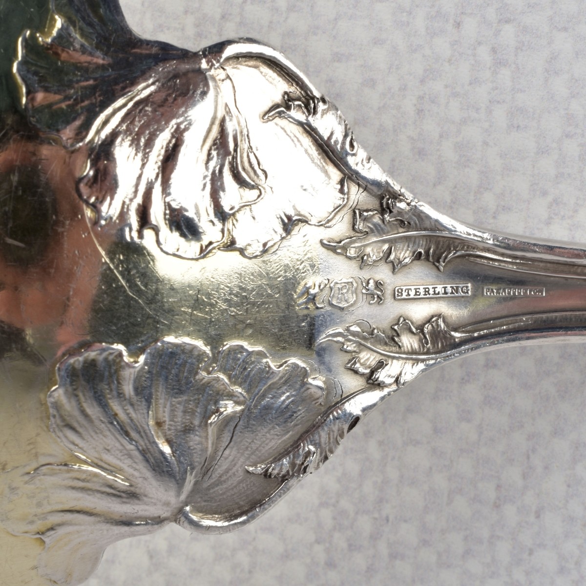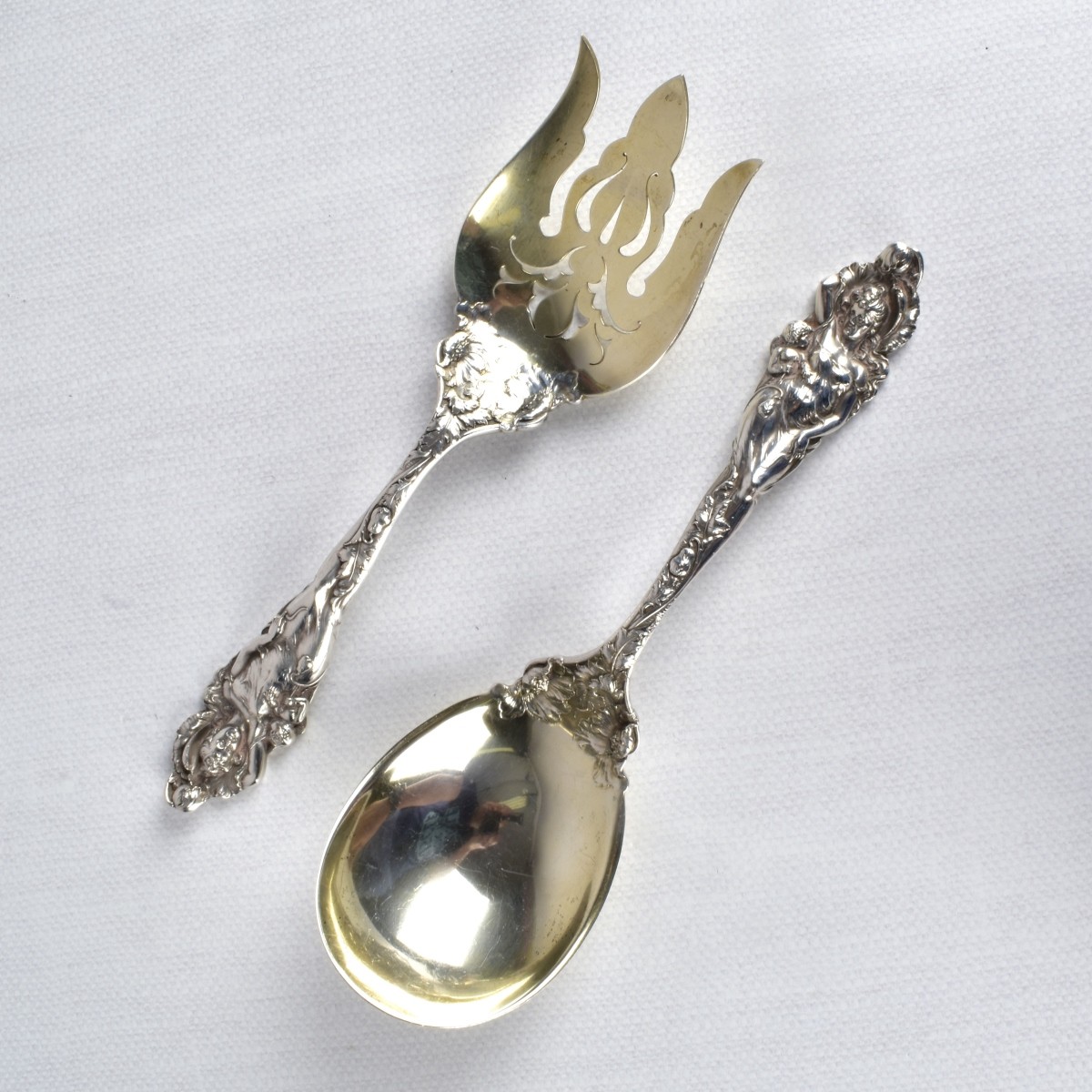Antique Two (2) Pieces Reed & Barton Sterling Silver "Love Disarmed" Pattern Salad Serving Set. Stamped (eagle-R-lion), STERLING, PAT. APPL'D.FOR. Circa 1900. Measures: 10-3/4" L. Weight: 14.10 troy ounces. Condition: Very good condition. Estimate: $200.00 - $400.00 Domestic Shipping: $58.00
