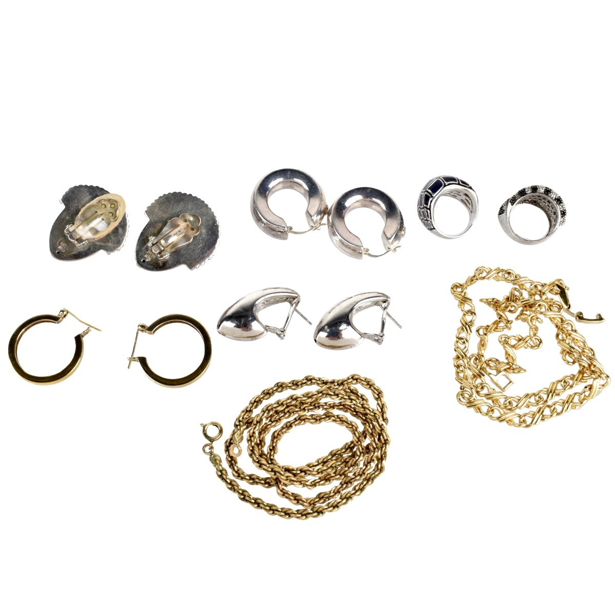 Vintage Sterling Silver Jewelry. To include four pair of earrings and two rings and two gold plated chains / necklaces. Silver items variously accented with black onyx, enamel and faux diamonds. Silver items stamped 925. Silver and onyx earrings measure 1-1/4" H, 1-1/8" W. Ring sizes 4-3/4. Longest chain / necklace measures 24" L. Approx. total gross weight of silver items: 81.36 grams. Condition: Good vintage condition. Estimate: $150.00 - $250.00 Domestic Shipping: $40.00