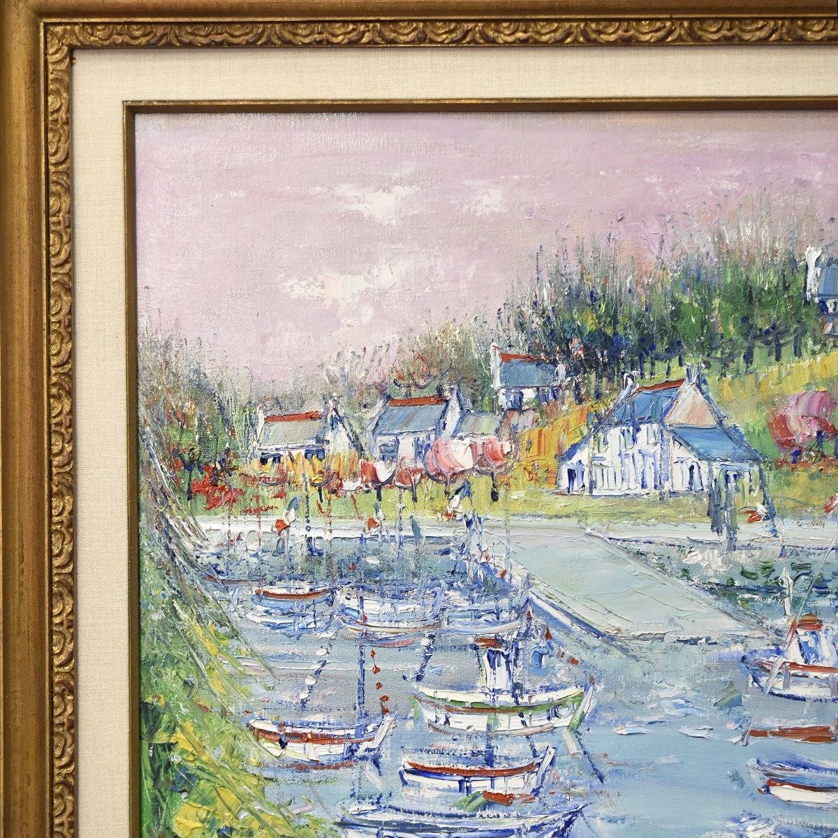Yolande Ardissone, French ( b. 1927) Imposto Oil on Canvas. Depicting boats in a harbor, houses, and flowers in the background. Signed left hand corner. Titled on reverse "La Terrasse A Doelan". Viewing area measures: 28" H, 23" W, 37" H, 32" W". Condition: Good condition. Estimate: $2000.00 - $2500.00 Domestic Shipping: Third party.