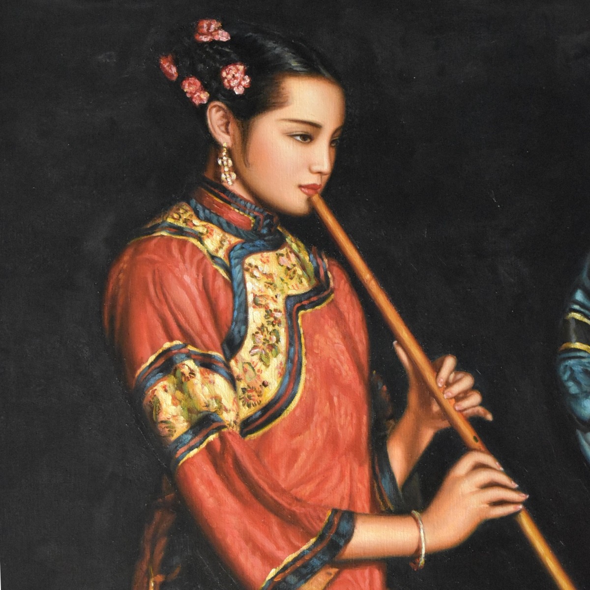 After Chen Yifei, Chinese (1946-2005) Hand Enhanced Giclee on Canvas of Three (3) Shanghai Ladies Playing Musical Instruments. Framed in a gold wood frame. Signed bottom left hand corner. Image area measures: 35" H, 47" W, frame measures: 46-1/2" H, 56-1/2" W. Condition: Very good condition. Estimate: $100.00 - $300.00 Domestic Shipping: Third party.