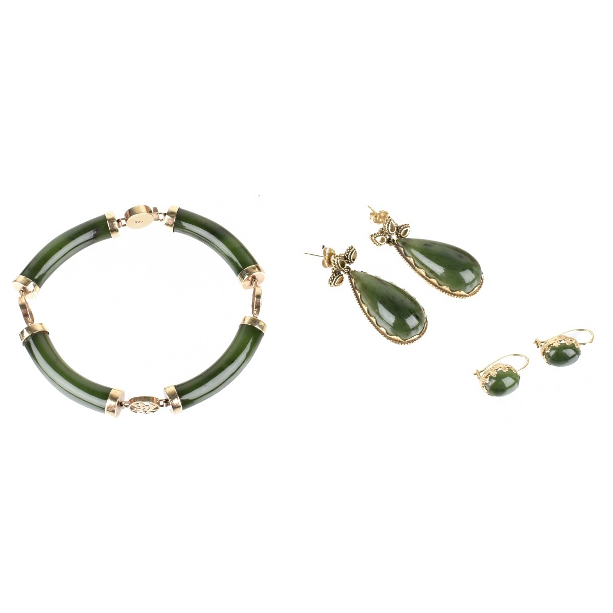 Vintage Nephrite Jade and 14 Karat Yellow Gold Link Bracelet and Two Pair of Earrings. Stamped 14K. Bracelet measures 7" L, 1/4" W. Pendant earrings measure 1-1/2" L, 1/2" W. Approx. total weight: 37.59 grams. Condition: Very good vintage condition. Estimate: $300.00 - $400.00 Domestic Shipping: $40.00