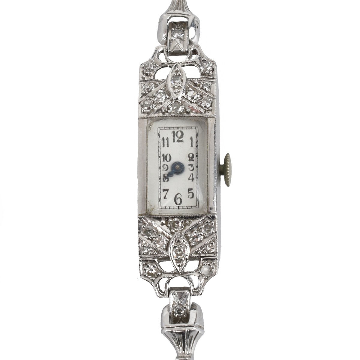 Lady's Antique Art Deco Diamond and Platinum Bracelet Watch. Set throughout with numerous round cut diamond. Manual wind movement. Case measures 23 x 10mm. Bracelet measures 7" L. Approx. weight: 16.59 grams. Condition: Good pre-owned condition. Appears to need servicing. For additional information and/or WhatsApp video please contact our resident GIA Graduate Gemologist, Russ Kodner at 954.650.5030 Estimate: $500.00 - $750.00 Domestic Shipping: $40.00