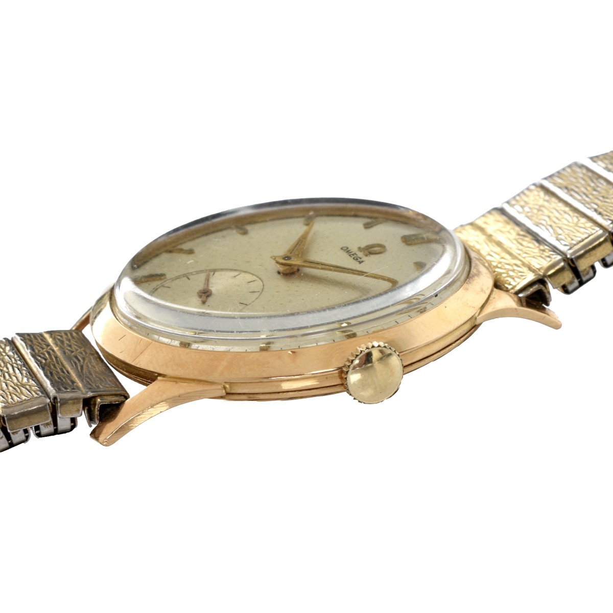 Man's Vintage Omega 14 Karat Yellow Gold Watch with Gold Filled Bracelet. Manual wind movement. Case Measures 35mm. Approx. gross weight: 50.73 grams. Condition: Good pre-owned condition. Running. Please note the gallery does not warranty the running conditon of watches. Estimate: $400.00 - $600.00 Domestic Shipping: $40.00