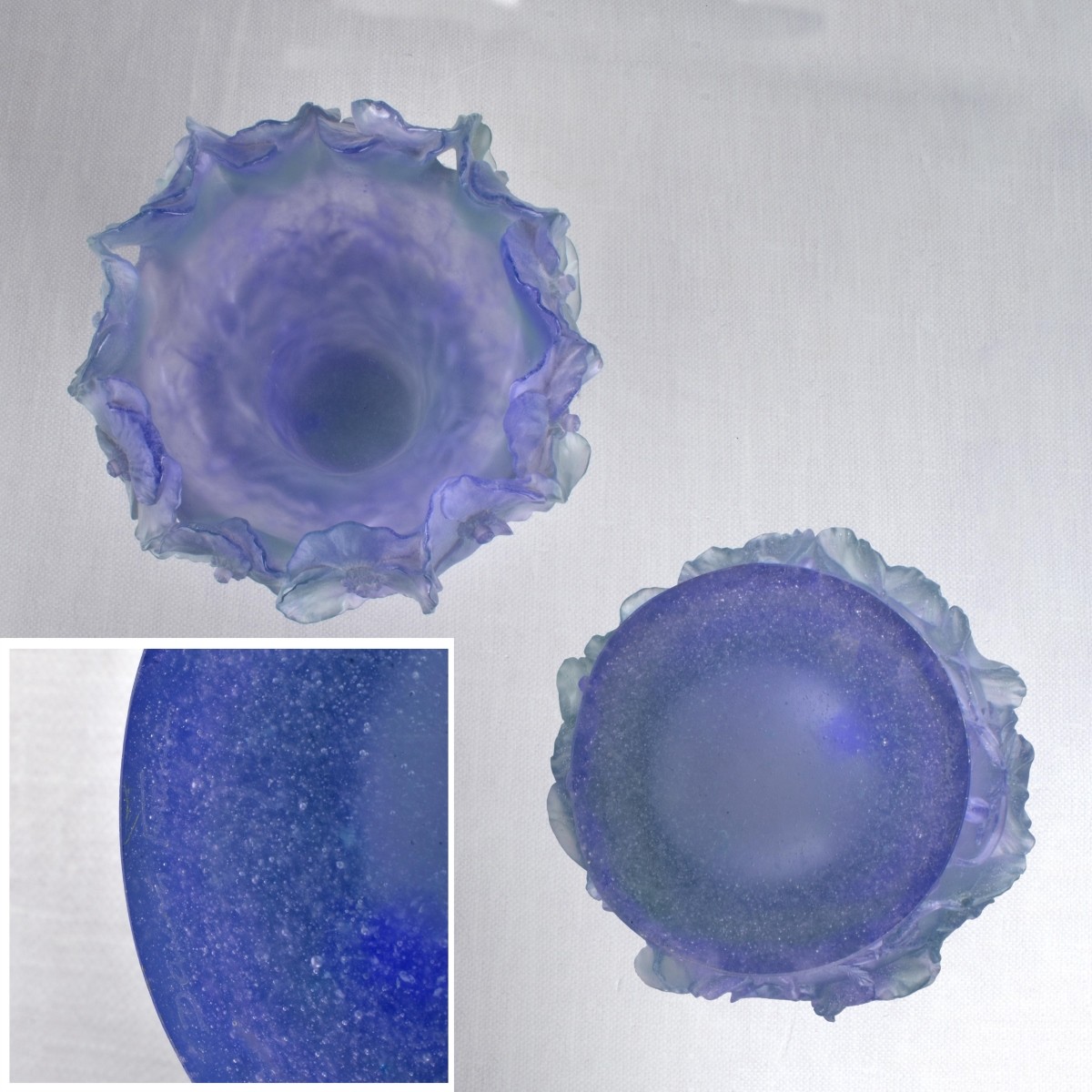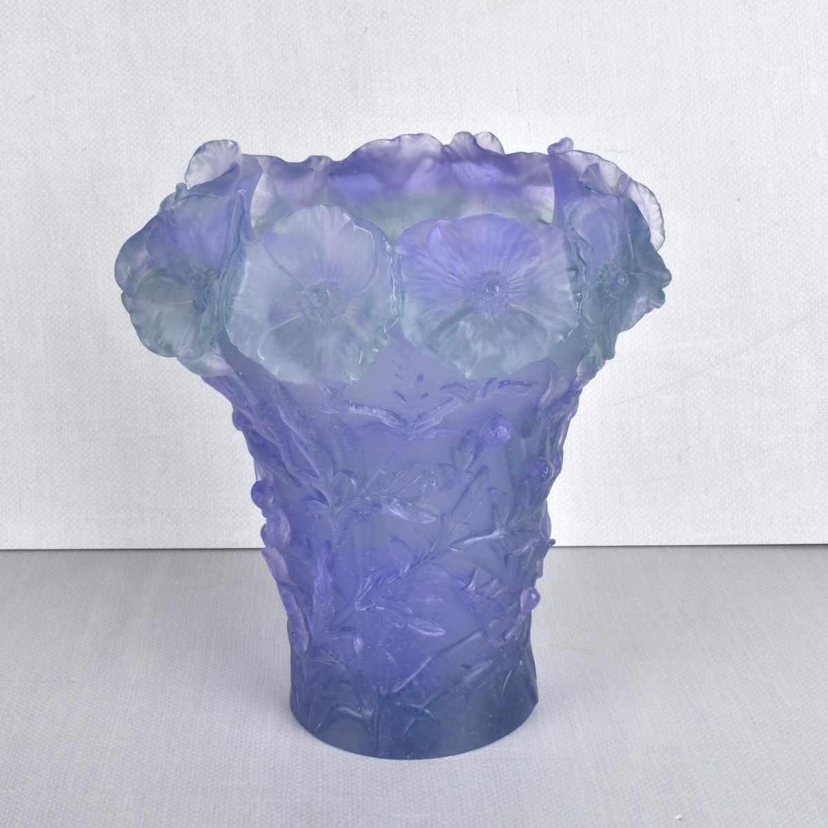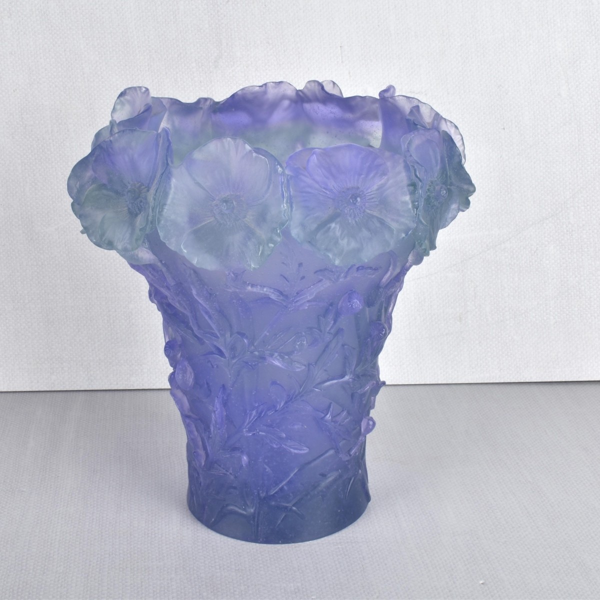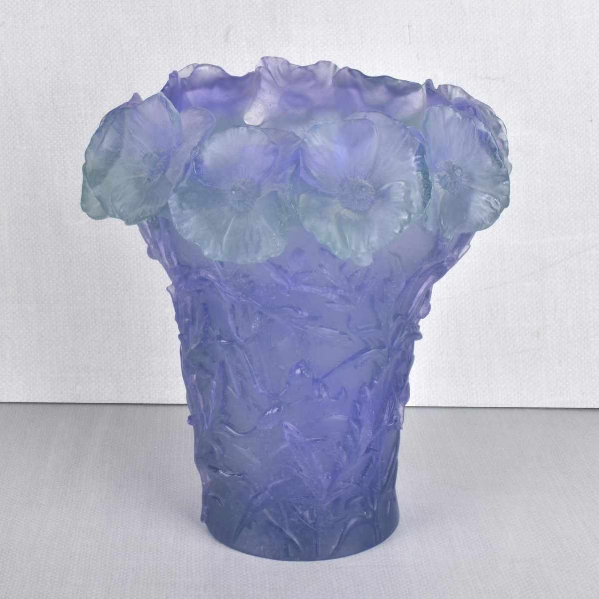 Large Daum Crystal Pate de Verre French "Hibiscus" Vase in Lavender Translucent Glass. Etched on the bottom "Daum France". Measures: 10-1/4" H, 9" D. Condition: Very good condition. Estimate: $700.00 - $900.00 Domestic Shipping: $92.00