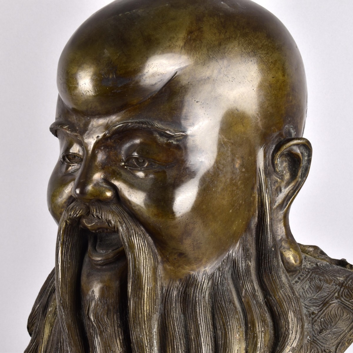 Modern Chinese Bronze Figural Head of a Sage. Mounted on a black marble base. Measures: 20-1/4" H, 11-1/4-1/2" W, 8-3/4" D. Provenance: Estate of Jacqueline Kott, Miami, Florida. Condition: Good condition. Estimate: $200.00 - $400.00 Domestic Shipping: Third party.