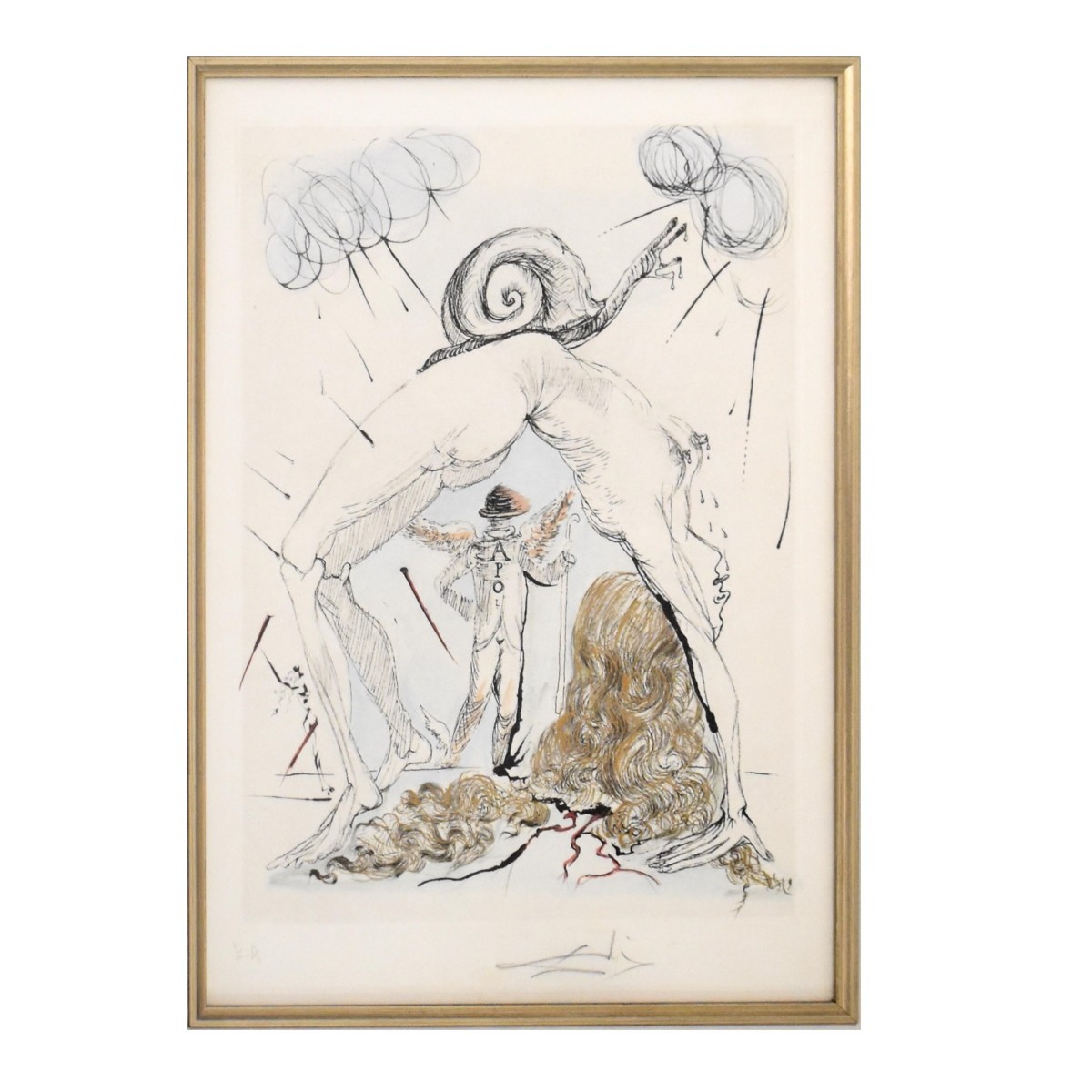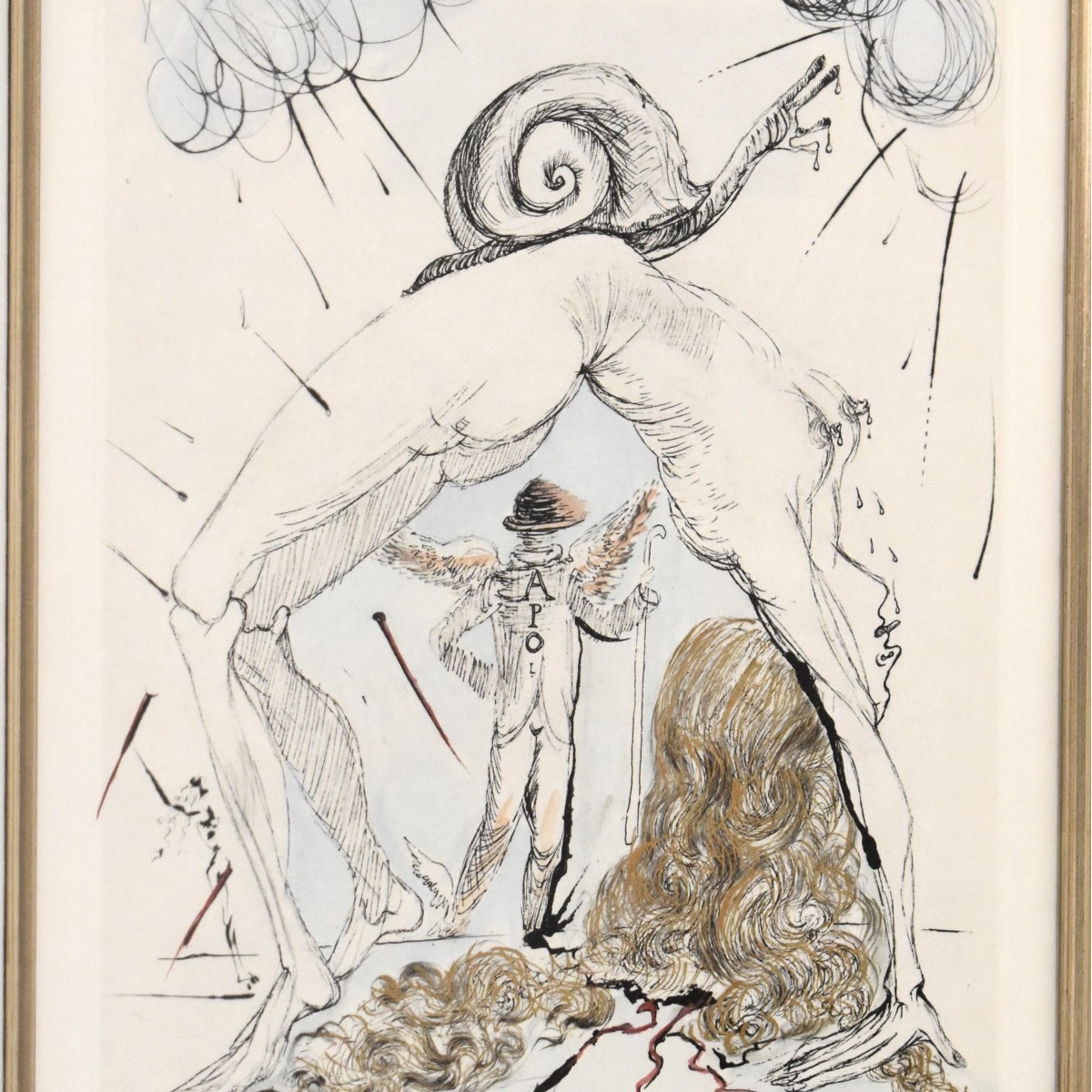 Salvador Dali, Spanish (1904-1989) "Lady with Snail" framed and matted dry point. Signed and marked E.A. (artists proof) in pencil as well as embossed signature and cut out window salutation to back. Sheet size measures: 14" H, 10-1/2" W, frame measures: 26" H, 22-1/2" W. Condition: Very good condition. Estimate: $700.00 - $900.00 Domestic Shipping: Third party.