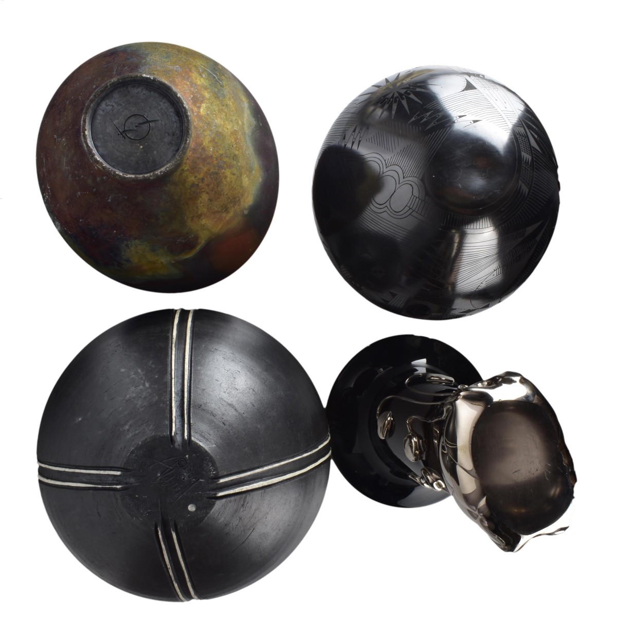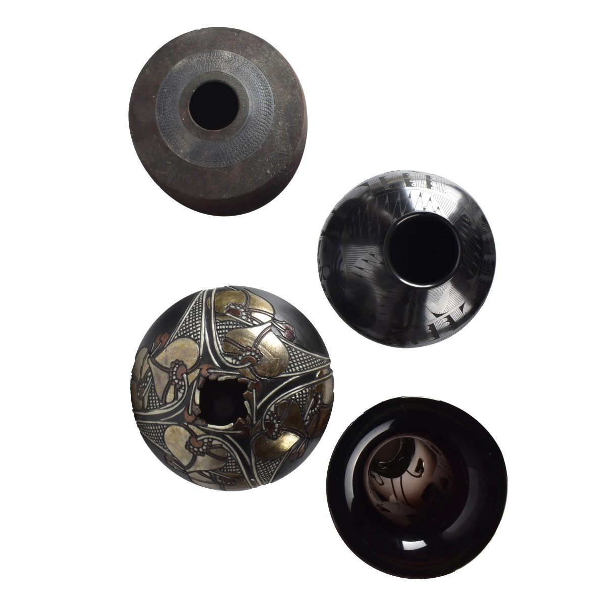 Collection of Four (4) Abstract Vases. Consisting of one (1) Vintage smoke art glass art nouveau vase with a metallic overlay. Signed "Wayne Filan 1982". Measures: 14" H, 9" Dia., one (1) Amil Art Sgraffiti pottery vase of a floral pattern on a black matte glaze, signed and dated 1984, measures: 12" H, 12" Dia., one (1) Amil Art Sgraffiti pottery vase of a stylized floral pattern on a black matte glaze, signed and dated 1985, measures: 12" H, 5" Dia., one (1) large Raku pottery vase, artist signed, measures: 12-1/4" H, 10" Dia., one (1) large black ware vase, signed Eusebio Sandoval on the bottom, measures: 10-1/2" H, 10-1/2" Dia. Condition: As is condition, vase dated 1985 has cracks. Estimate: $300.00 - $400.00 Domestic Shipping: Third party