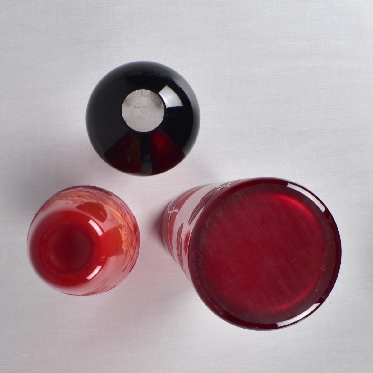 Three (3) Pieces Modern Cameo Art Glass Vases. Comprising one (1) tall ruby vase vase with sandblasted flowers, signed "John Gilmor Jan Gimor 1979", measures: 17" H, 4-1/8" Dia., one (1) red/orange cameo cut and sandblasted with large flowers, artists signed, measures: 10-7/8" H, 5" Dia., one (1) Egyptian motif vase cut to a frosted glass, signed "David Wedsworth 1983", measures: 6-1/2" H, 4-3/4" Dia. Condition: Good condition. Estimate: $100.00 - $200.00 Domestic Shipping: Third party.