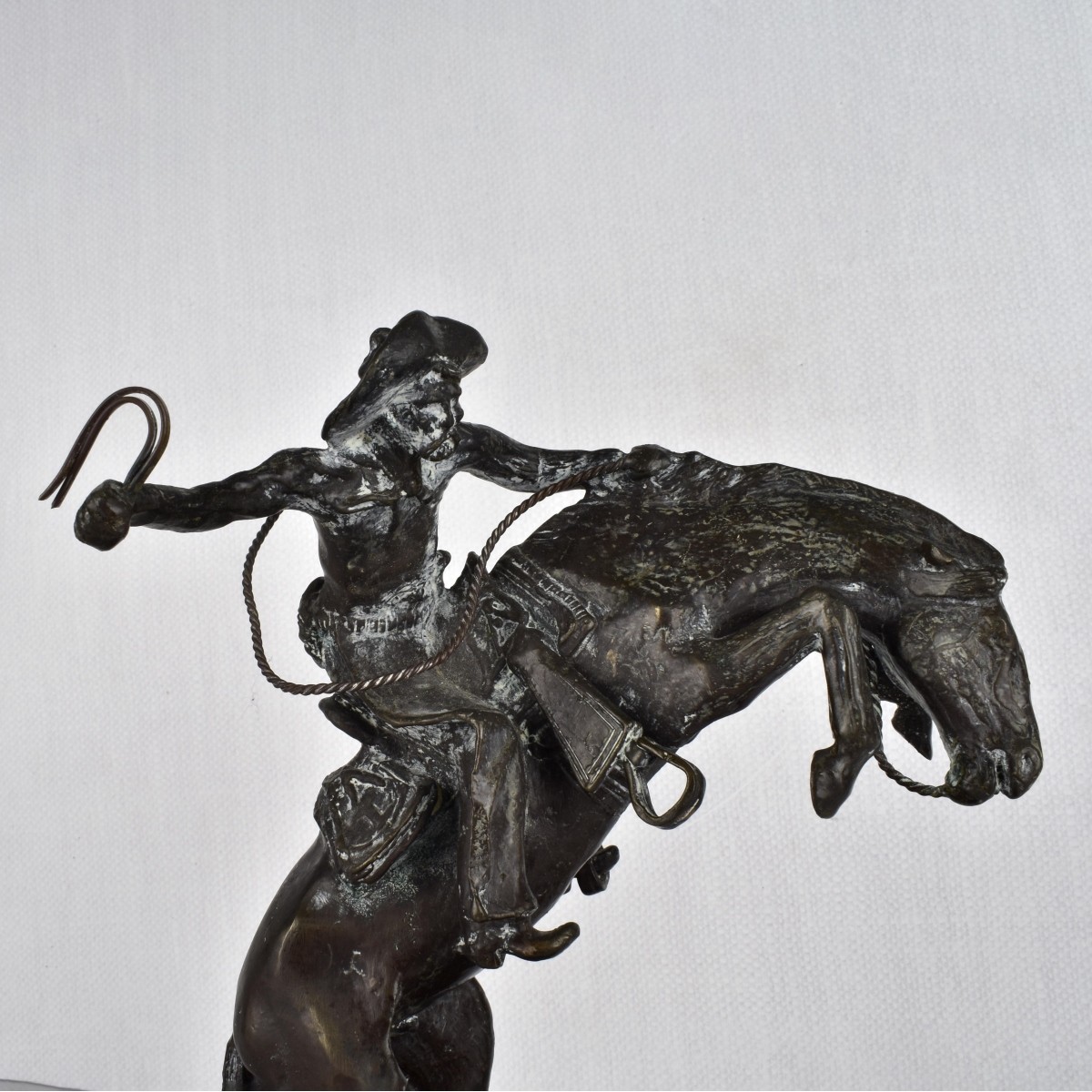 After Frederic Remington, American (1861-1909) "Bronco Buster" Bronze. Signed in the bronze plinth as well as an attached brass name plate reading " Bronco Buster By Frederic Remington". Mounted on a black veined oval base. Overall height measures: 10-3/4" H, 7-1/4" W, 5-1/2" D. Condition: Good condition, some scuffs and small chip to marble base. Estimate: $50.00 - $150.00 Domestic Shipping: $74.00