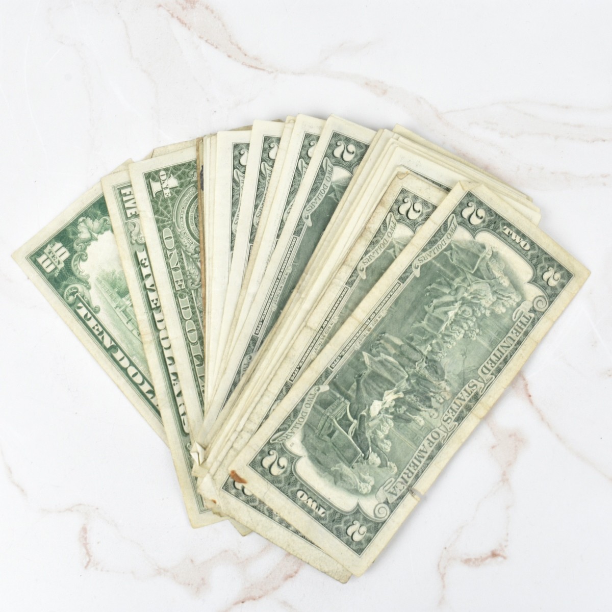 U.S. Currency Various Denominations. Thirty-four (34) $2.00 notes, five (5) $1.00 Silver certificates notes, one (1) $5.00 red seal 1963 note, one (1) $10.00 green seal 1928 B note. Condition: Circulated, dog eared, some written on, as is condition, commensurate with age and use. Estimate: $150.00 - $250.00 Domestic Shipping: $42.00