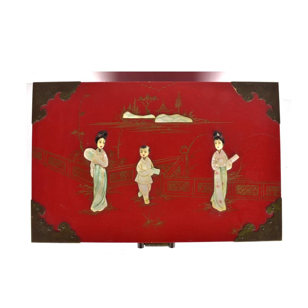 Vintage Asian Red Lacquered Three (3) Drawer and Flip up Top Jewelry Chest with Metal Fittings and Mother of Pearl Inserts. Measures: 10-3/4: H, 14" W, 9" D. Condition: Good condition. Estimate: $200.00 - $300.00 Domestic Shipping: $88.00