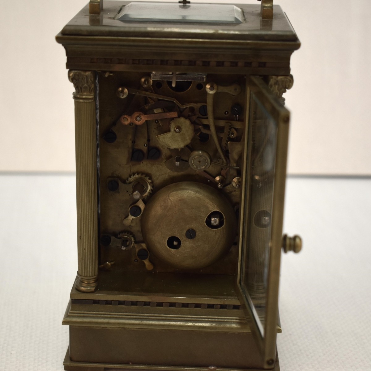 Antique French Gold Gilt Carriage Clock. Decorated with three painted plaques with an hour repeater and beveled glass on the top and front. No key present 19/20 th century. Measures with handle up: 8-1/2" H, 4-1/4" W, 3-5/8" D. Condition: Good antique condition. Please note the gallery does not warranty the running condition of clocks. Estimate: $300.00 - $500.00 Domestic Shipping: $58.00